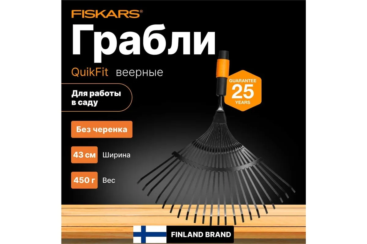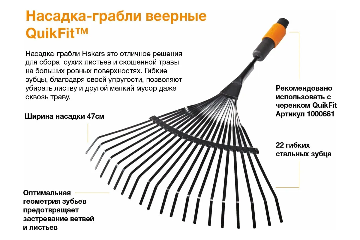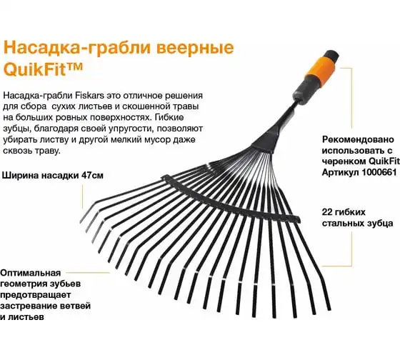 Насадка-грабли веерные Fiskars QuikFit 1000644 применяется с черенком 1000661. Надежное крепление исключает соскальзывание насадки в процессе эксплуатации.