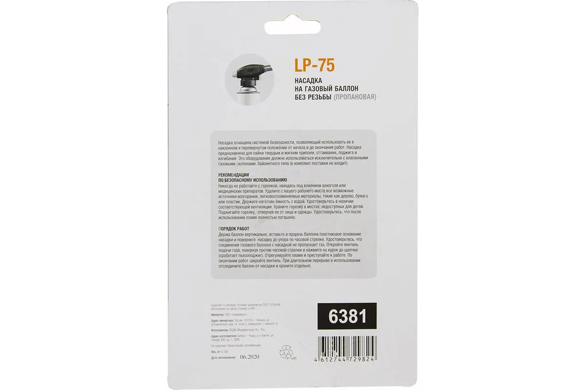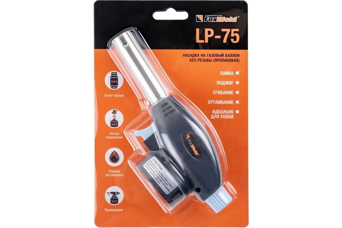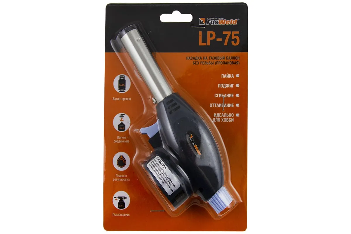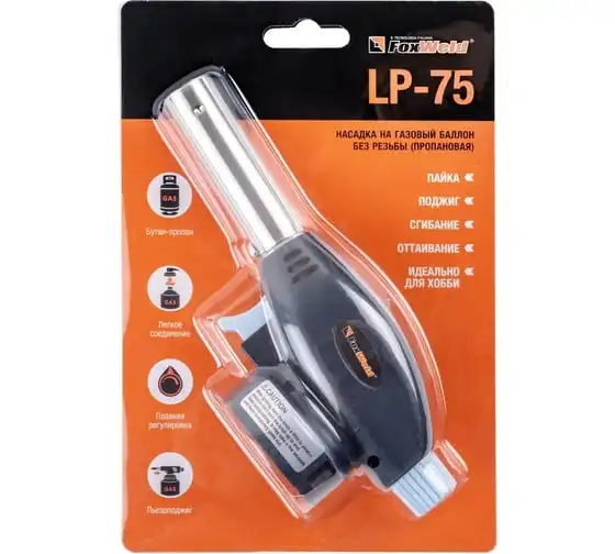 Насадка на баллон без резьбы FOXWELD LP-75 пропановая 6381 предназначена для пайки твердым и мягким припоями, поджига и нагрева.
