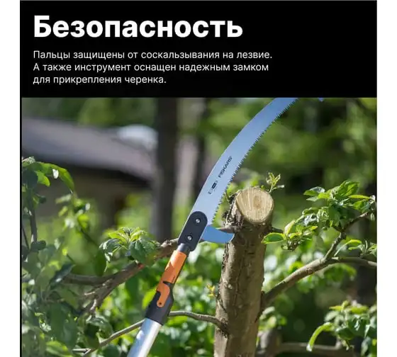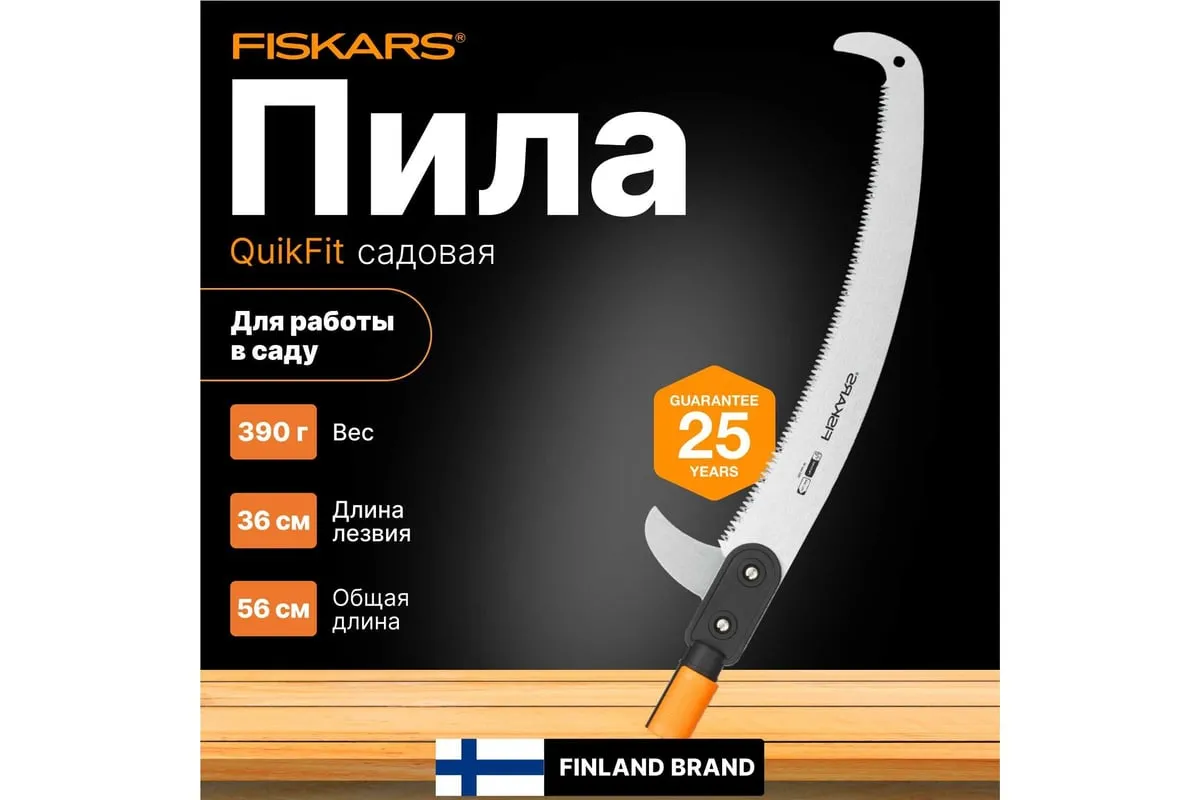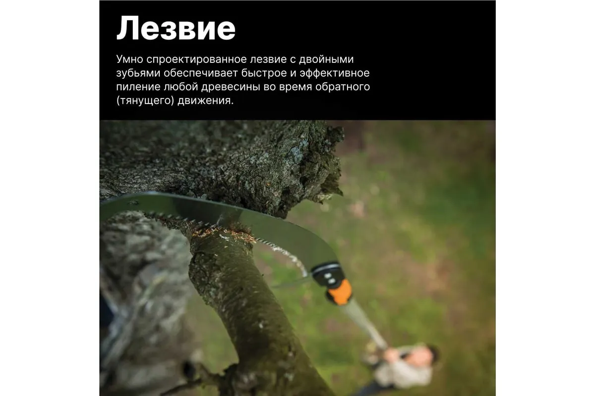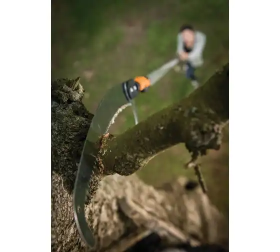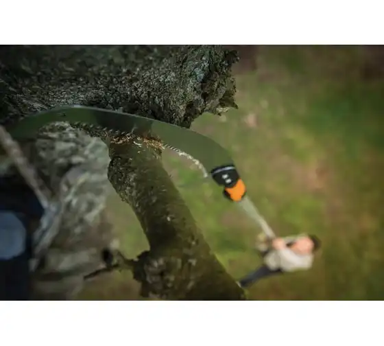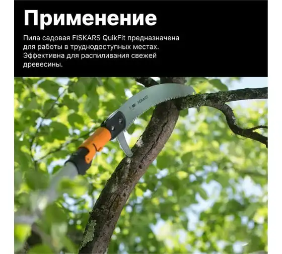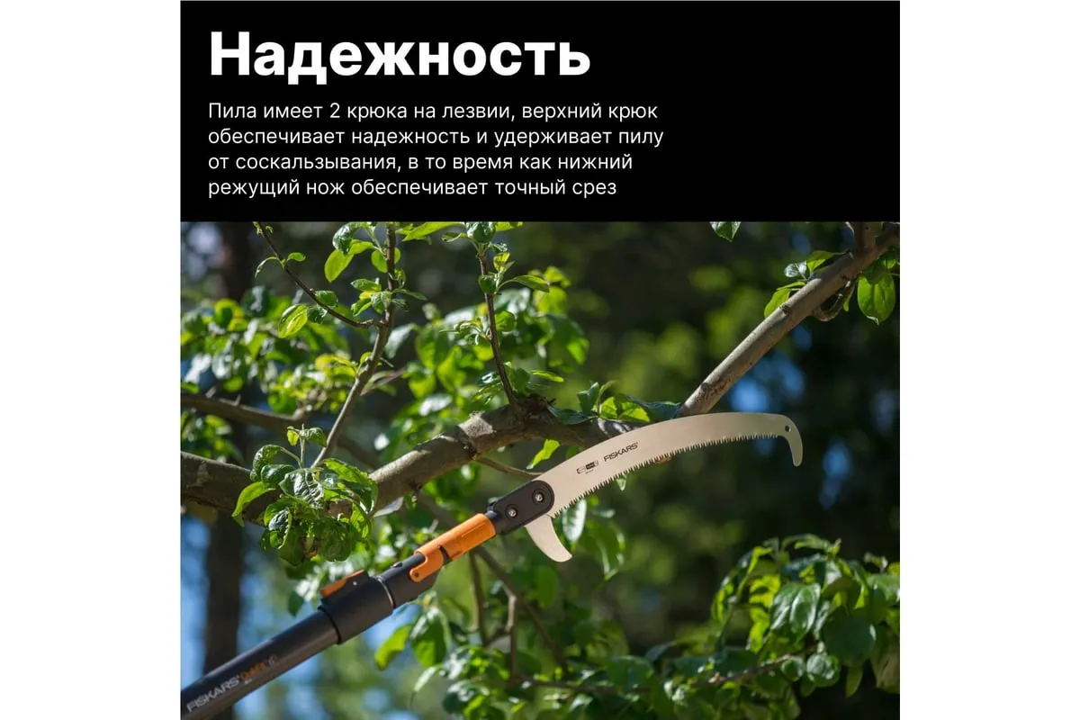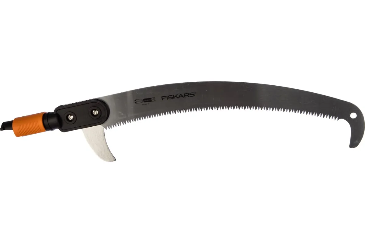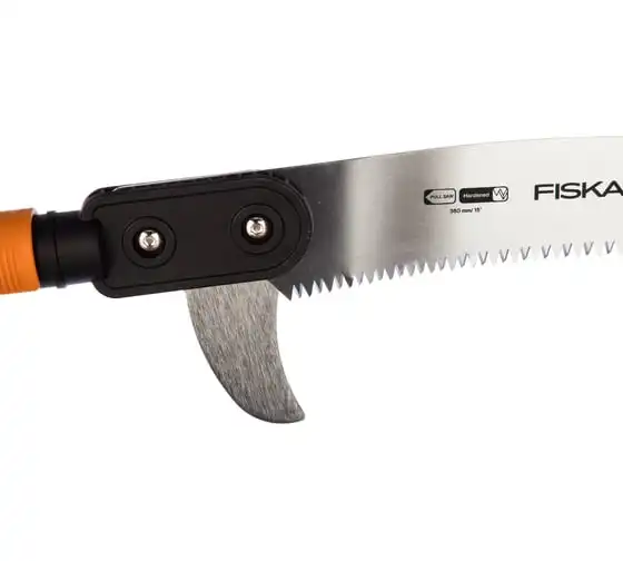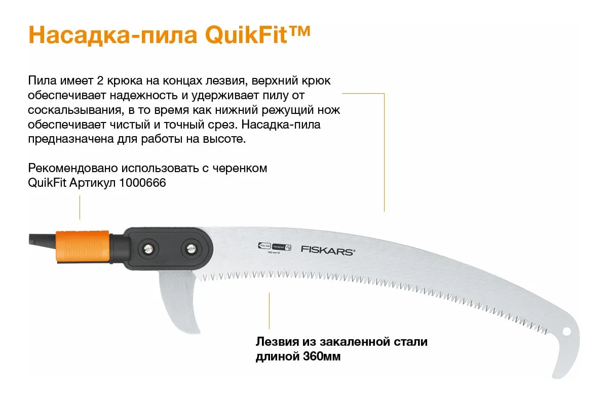 Насадка-пила Fiskars QuikFit 1000691 оснащена двумя крюками по обоим конца лезвия. Это позволяет избежать соскальзывания в процессе пиления.