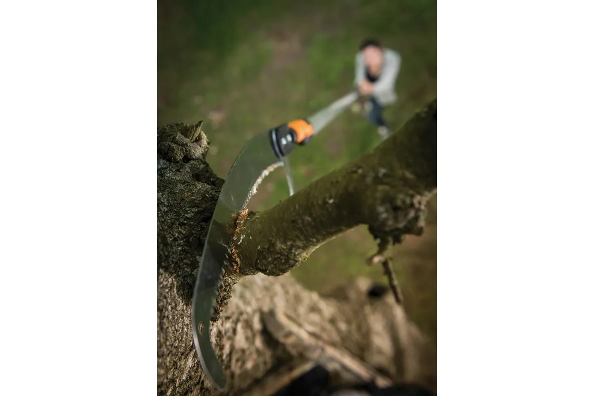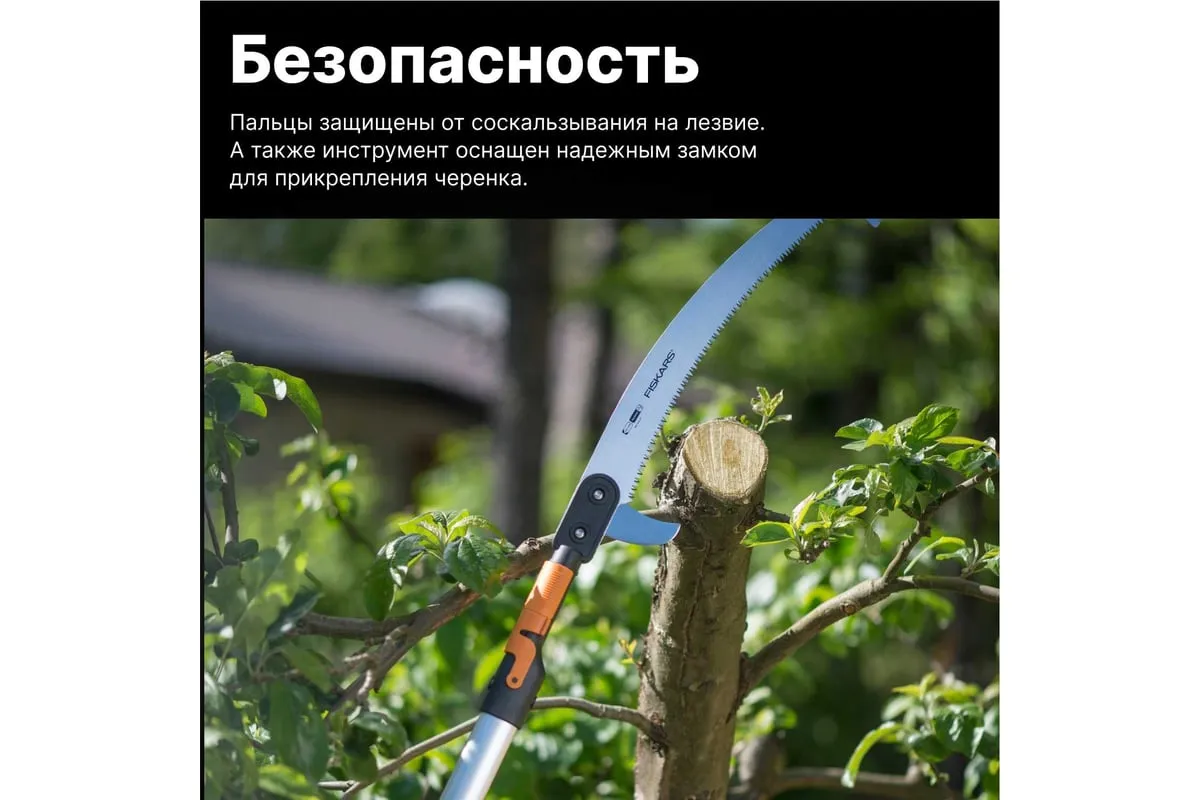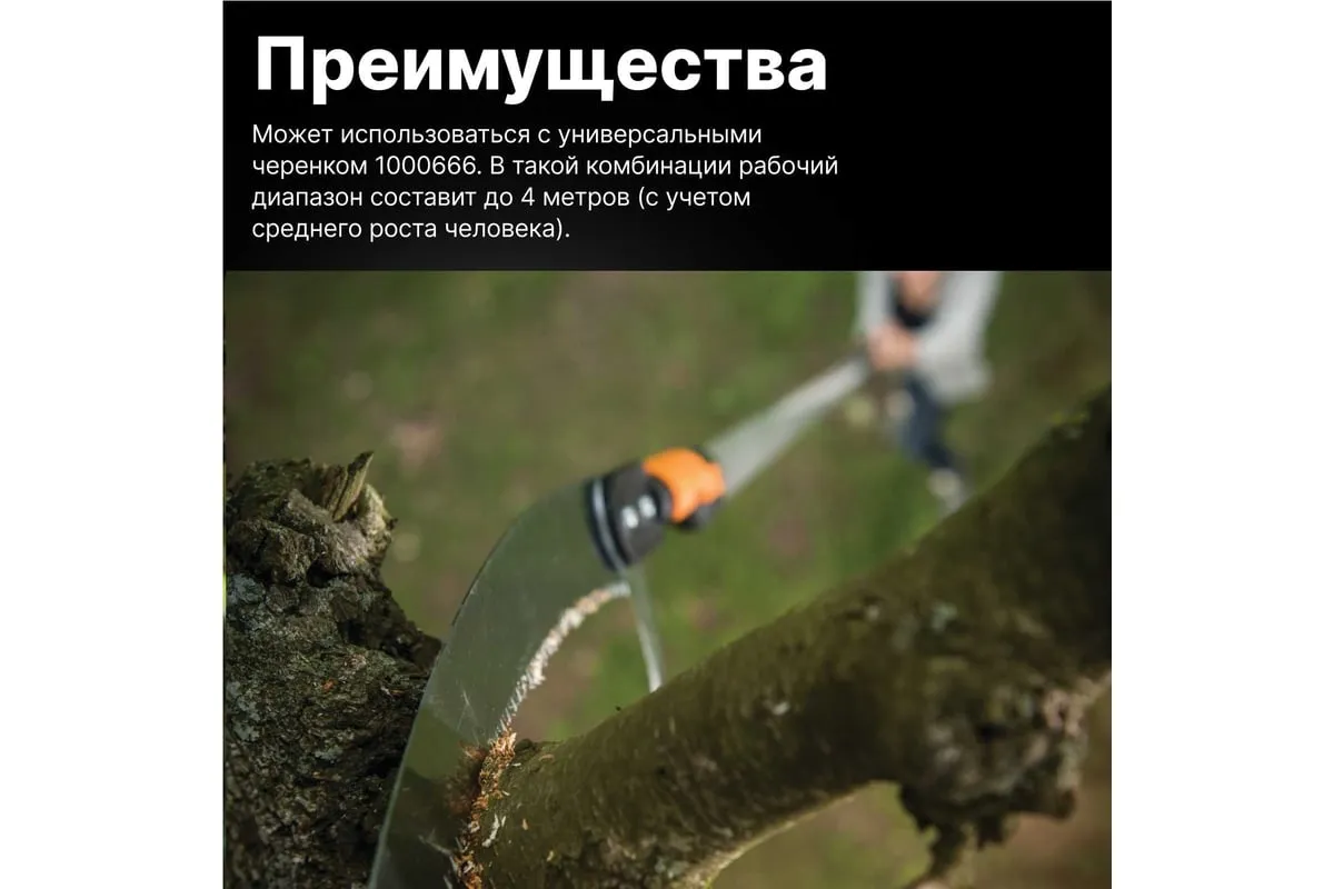 Надежное крепление к телескопическому черенку Fiskars QuikFit 1000666 (приобретается отдельно) обеспечивает эффективность работы на высоте до 4 метров.