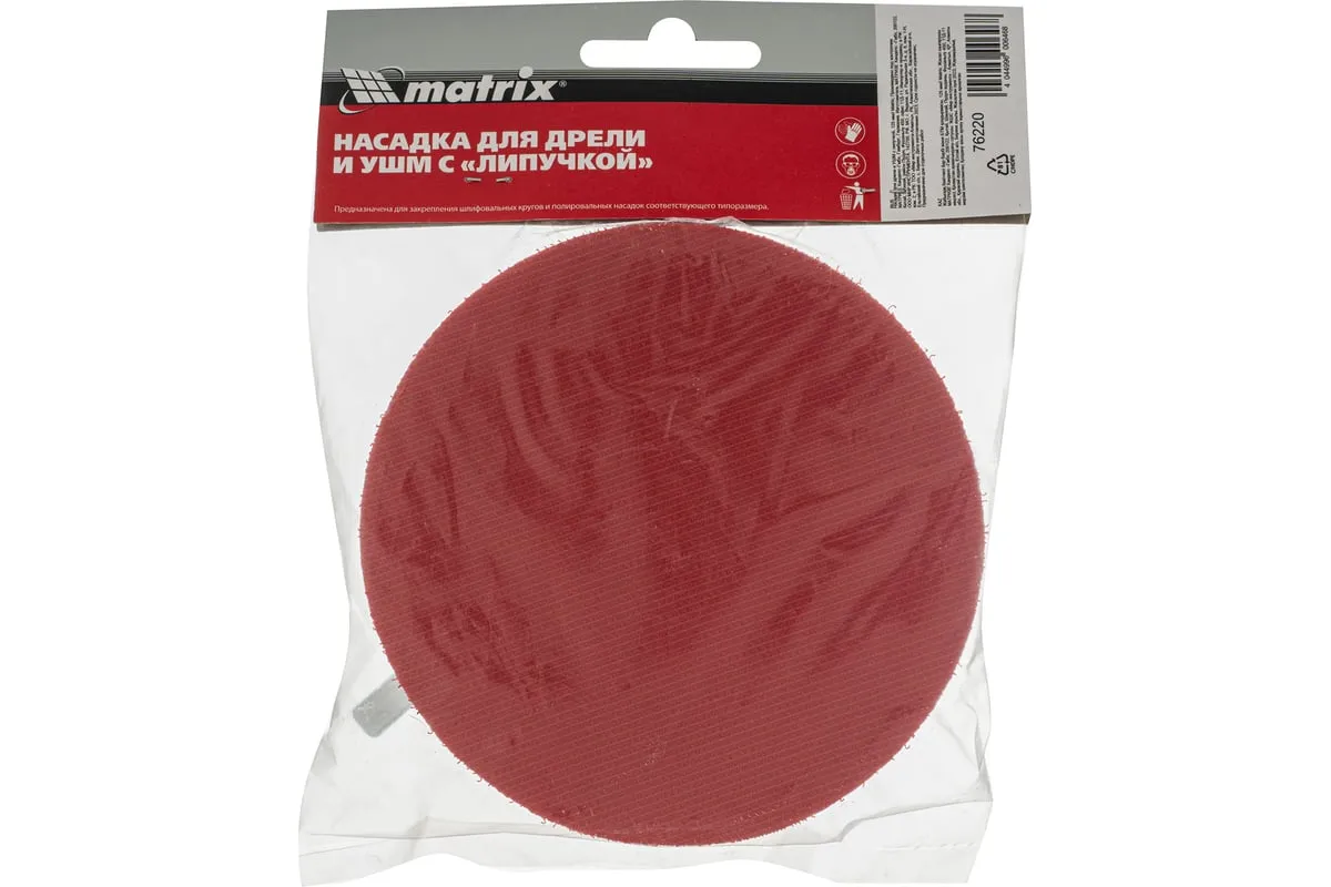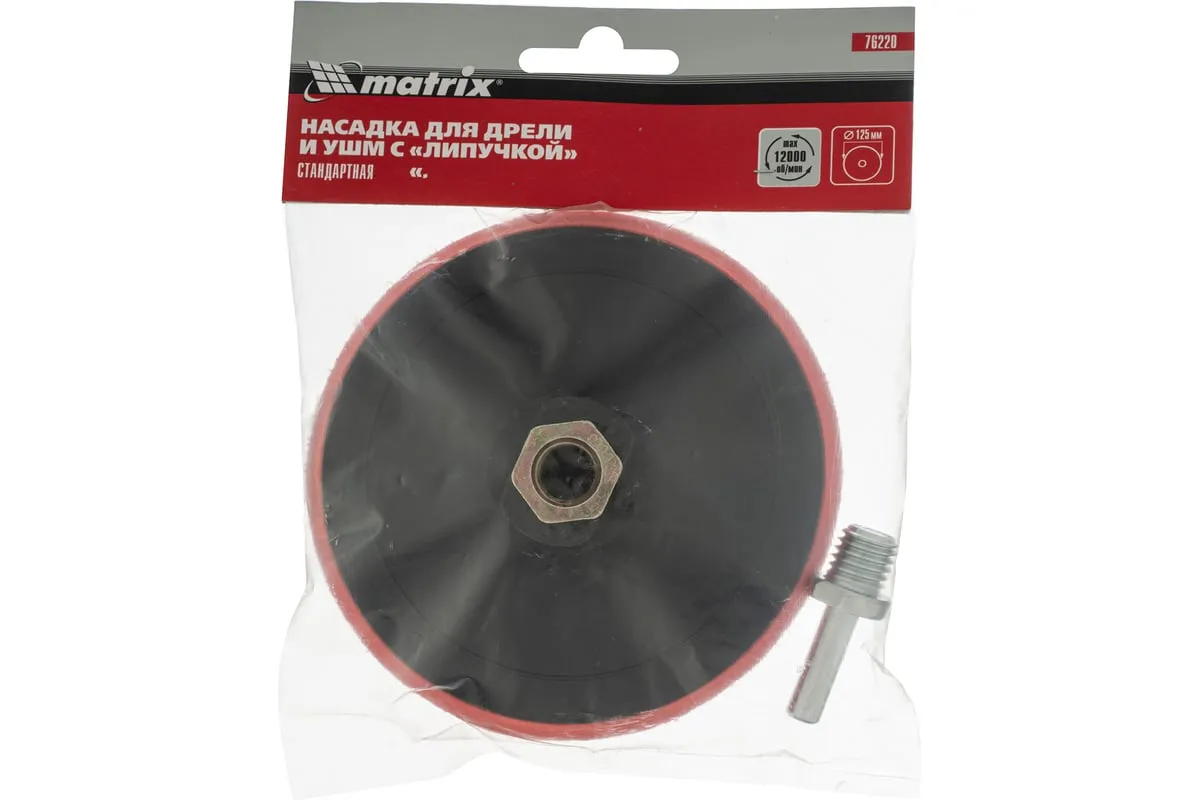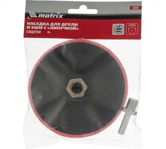 Насадка для дрели и УШМ с липучкой Matrix 76220 используется с дрелями и углошлифовальными машинами, поддерживающими оснастки диаметром 125 мм и имеющими рабочий диапазон вращения до 12000 об/мин. Предназначена для установки абразивных и полировальных кругов на ворсовой подложке. Насадка с демпферной вставкой из вспененного этиленвинилацетата (EVA) универсальна и подходит для всех видов полировальных и шлифовальных работ.