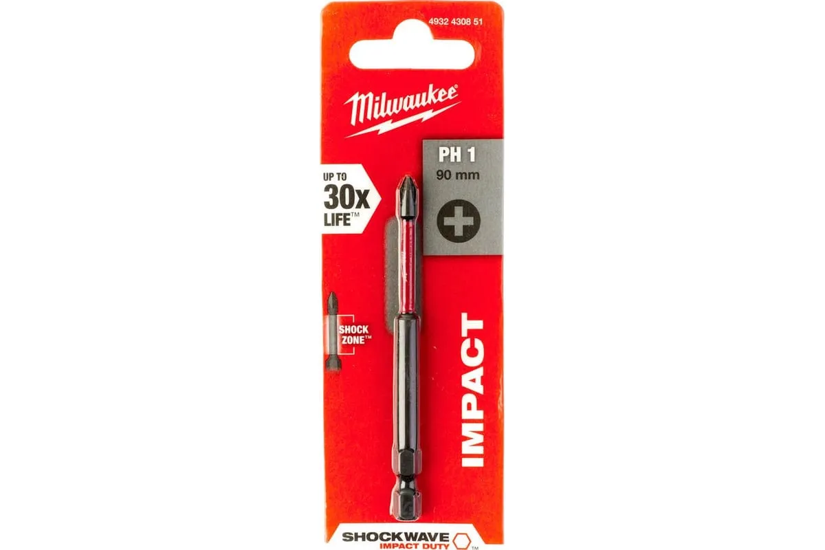 Насадка SHOCKWAVE Milwaukee 4932430851 предназначена для работы с ударными шуруповертами и гайковертами при монтаже/демонтаже крепежа имеющего шлиц PH1. Изготавливается из запатентованного сплава Impact duty. Компрессионный кованый наконечник обеспечивает отличную посадку в головке винта.