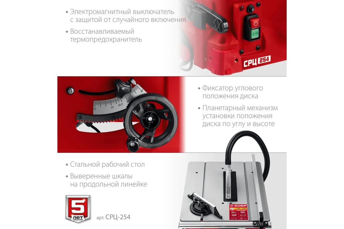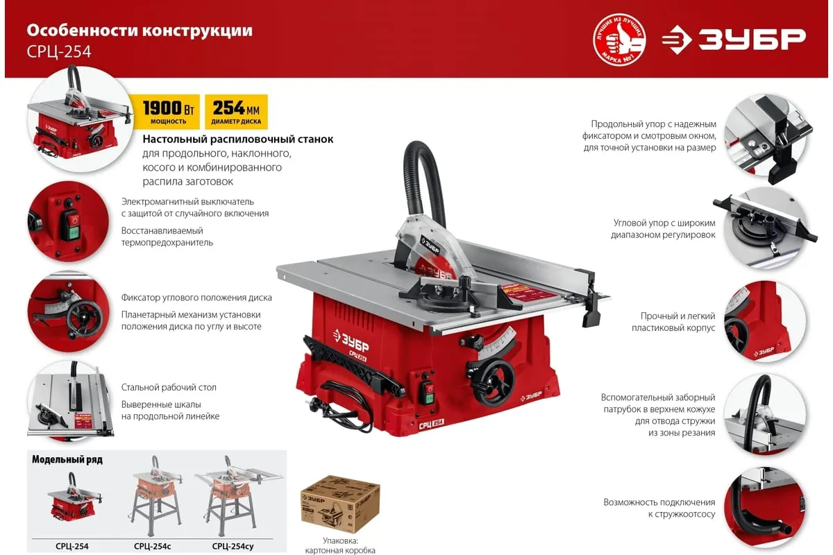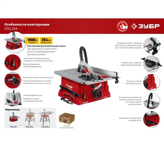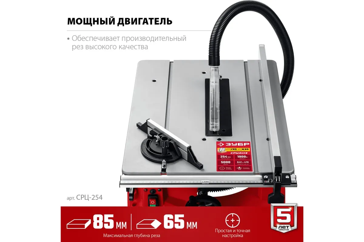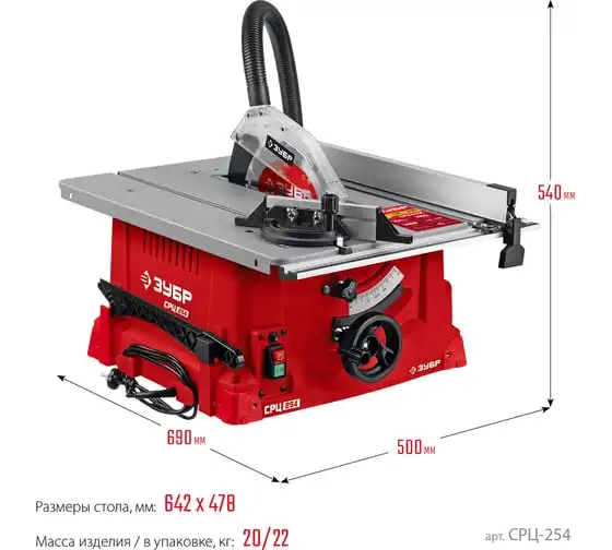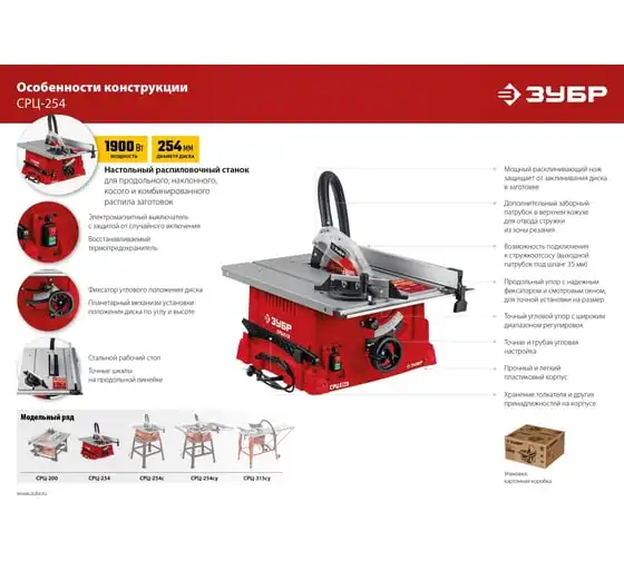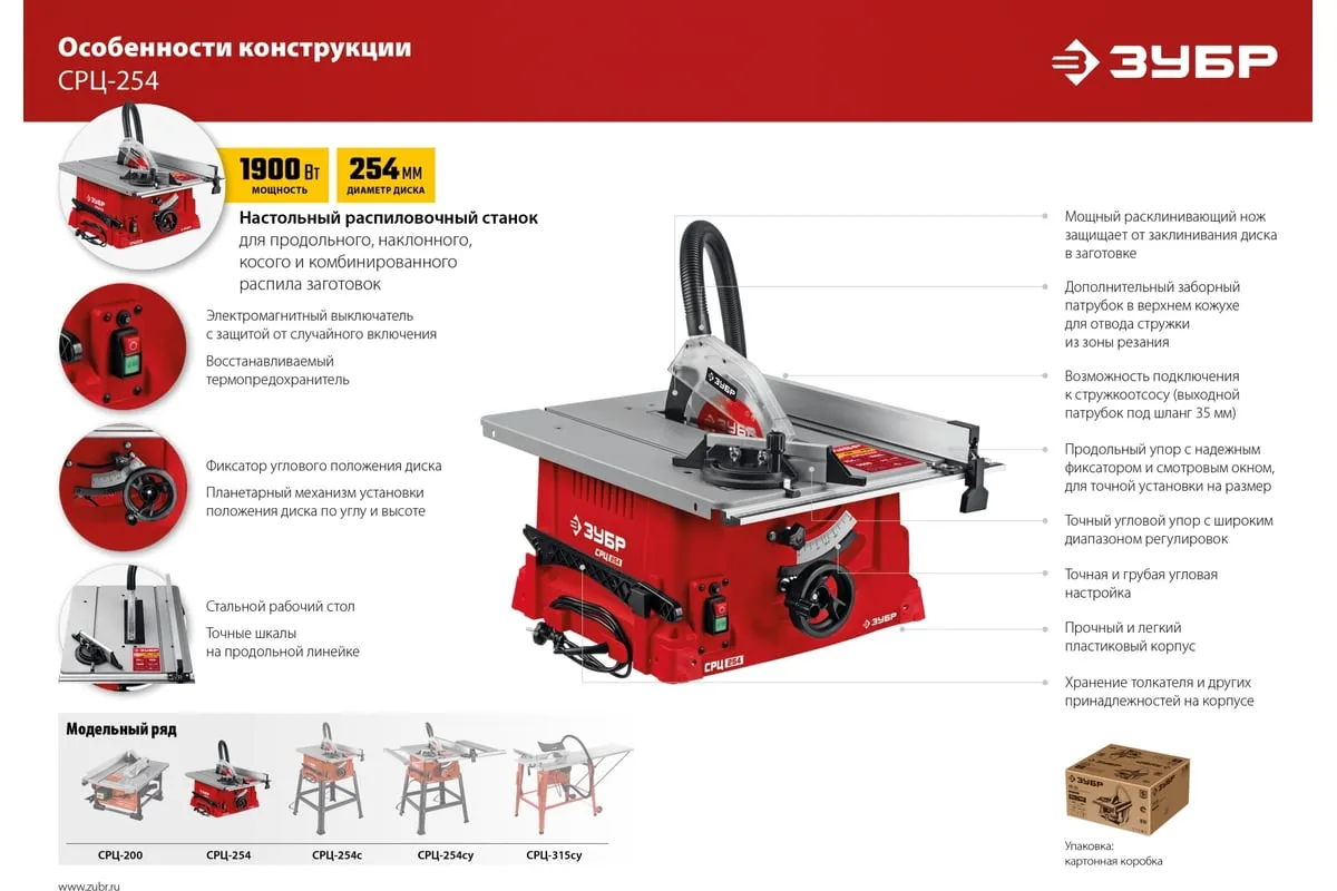 Настольный распиловочный станок 1900 Вт ЗУБР СРЦ-254 применяется для большинства работ по дереву: продольного, наклонного, косого и комбинированного распила. Имеет небольшие размеры и удобное управление Наличие сальников и кожуха защищает внутренние компоненты от попадания пыли, исключает быстрый износ. Можно разместить на любой горизонтальной поверхности: столе или верстаке.