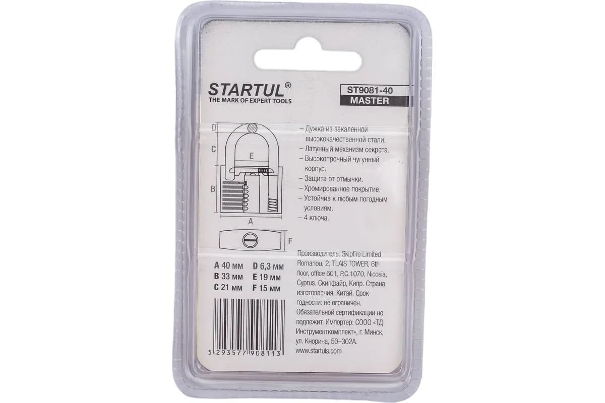 Навесной замок STARTUL 40 мм Master ST9081-40 отличается небольшими габаритами. Дужка из закаленной высококачественной стали, высокопрочный чугунный корпус и хромированное покрытие обеспечивают надежность и долгий срок службы. Устойчив к любым погодным условиям.