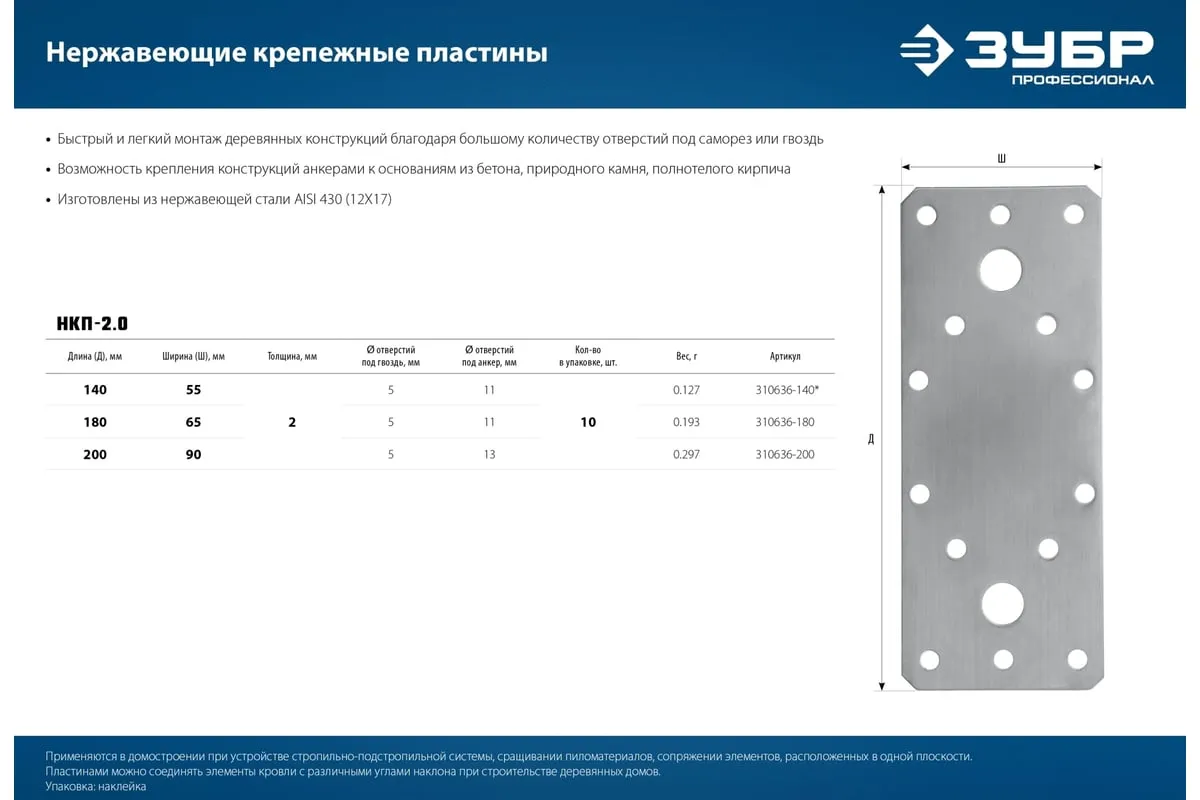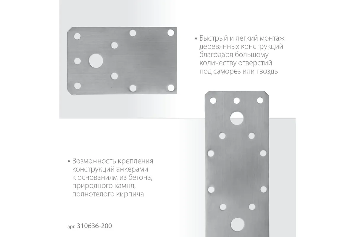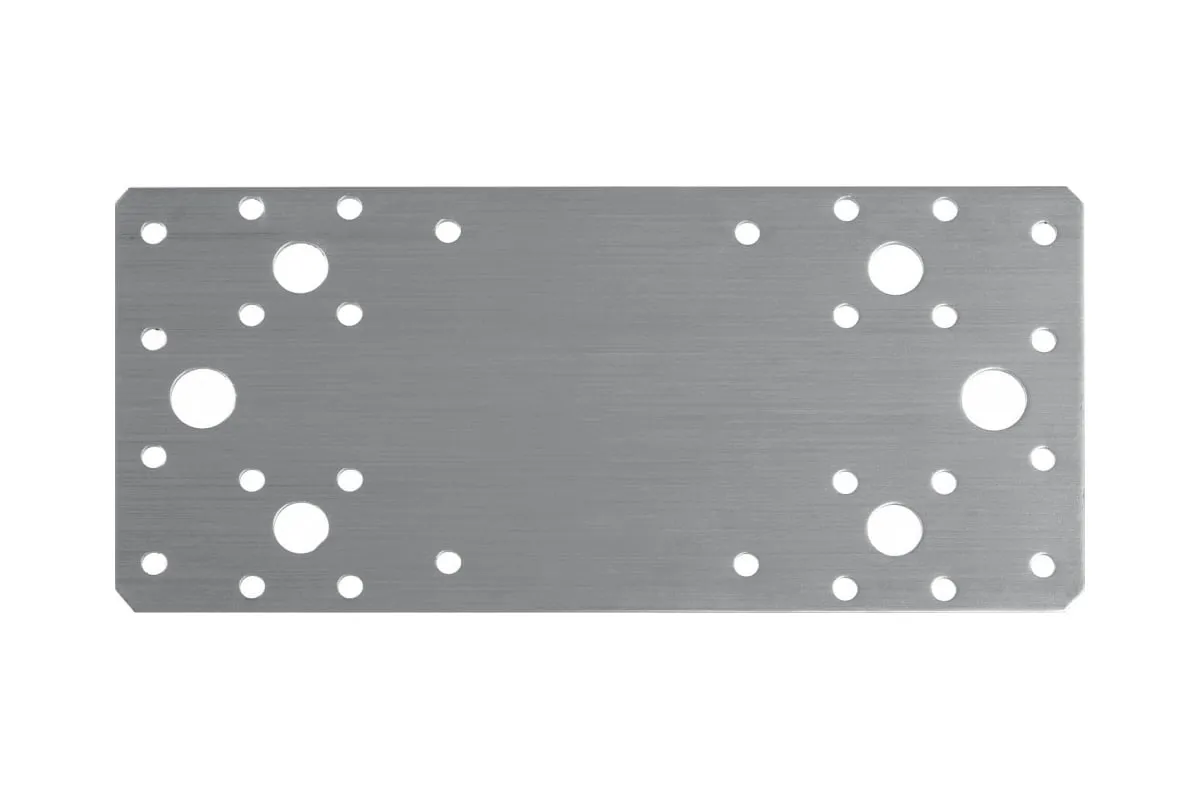 Пластины различных размеров позволяют выполнять соединения двух или более элементов, находящихся в одной плоскости. Характерный пример крепления с помощью пластин - коньковое соединение двух стропил. В зависимости от типа пластины, крепление может выполняться с помощью гвоздей, саморезов, болтов и анкеров. Монтаж не требует предварительной врезки или создания пазов, выступов и прорезей. Формирование соединений возможно как с внутренней, так и с внешней стороны конструкции. Для монтажа деревянных конструкций совместно с перфорированными изделиями используются специальные ершеные гвозди с конической головкой или саморезы.