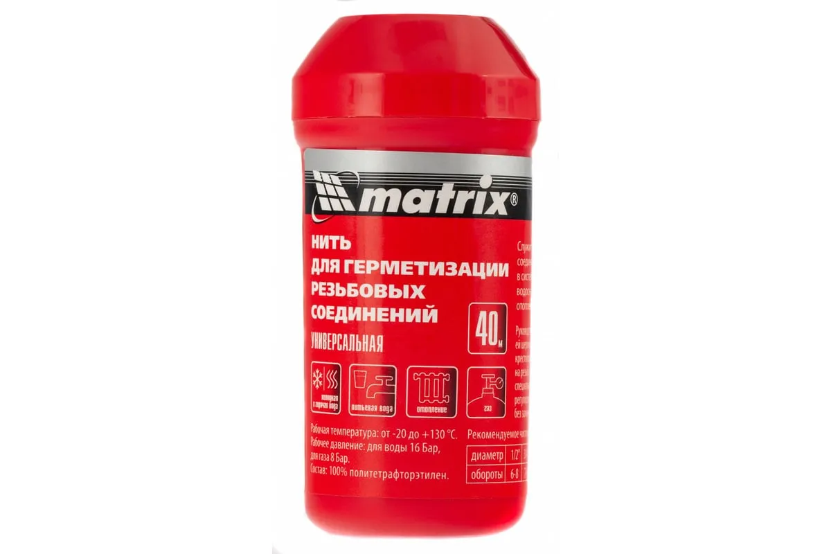 Универсальная нить Matrix 88887 длиной 40 м используется для уплотнения и герметизации резьбовых соединений. Подходит для металлических и пластиковых труб, используется для монтажа и ремонта систем отопления, газоснабжения, холодного и горячего водоснабжения. Оптимальна для труб, транспортирующих питьевую воду. Нить выдерживает давление газа до 8 бар и давление воды до 16 бар.