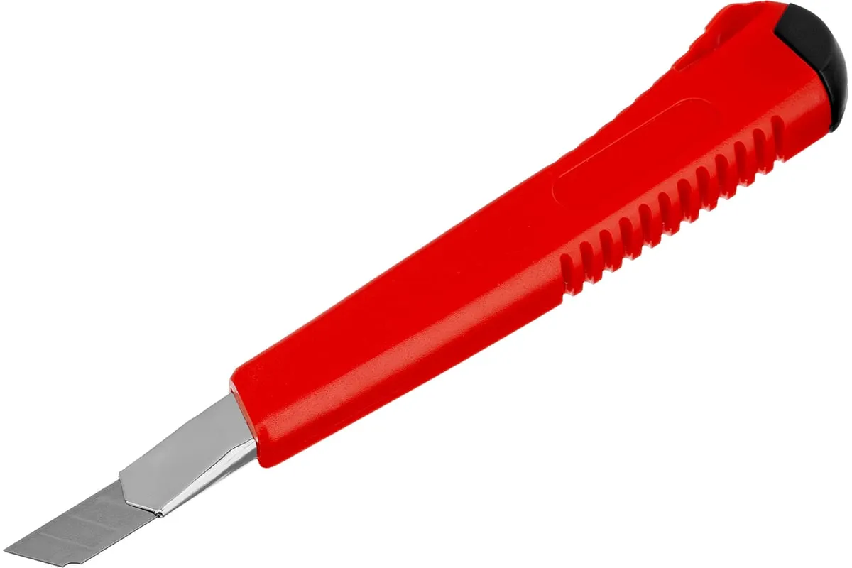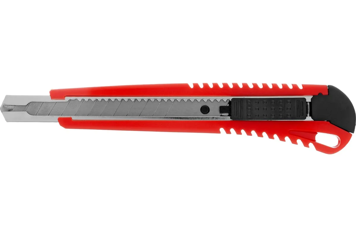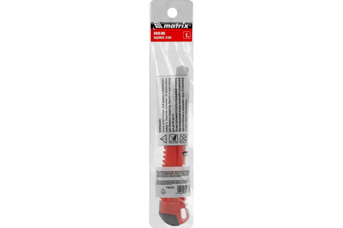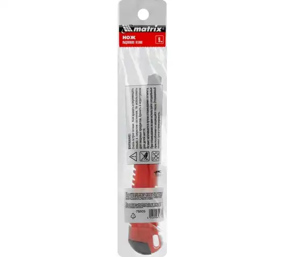 Нож Matrix 78909 с выдвижным лезвием шириной 9 мм и металлической направляющей подходит для профессионального и бытового использования. С его помощью можно разрезать картон, бумагу, скотч, кожу или обои. Инструмент прослужит долго, т.к. металлическая направляющая увеличивает его прочность.