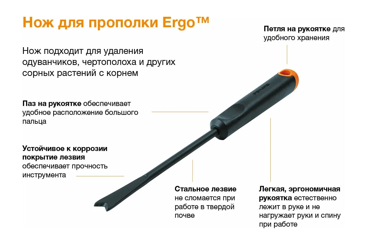 Нож для прополки Fiskars ErgoTM 1027031 – незаменимый помощник в уходе за грядами и клумбами. Используется для удаления сорных растений, таких как одуванчик, чертополох и другие сорняки с длинными корнями. Благодаря прочной конструкции инструмент подойдет для обработки твердой почвой. Рабочая часть ножа выполнена из стали и имеет антикоррозийное покрытие, что обеспечивает долгий срок службы.