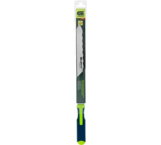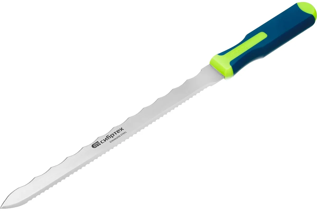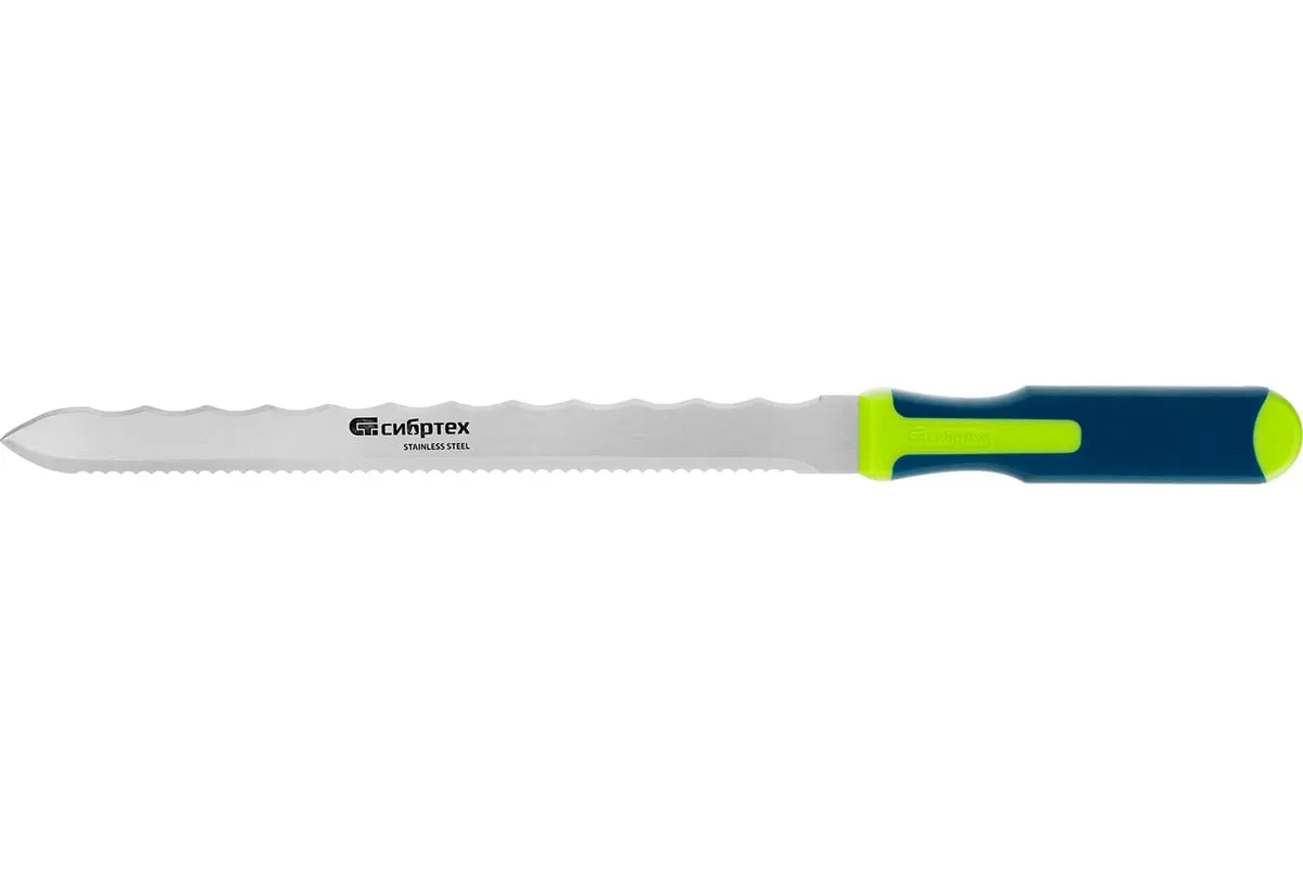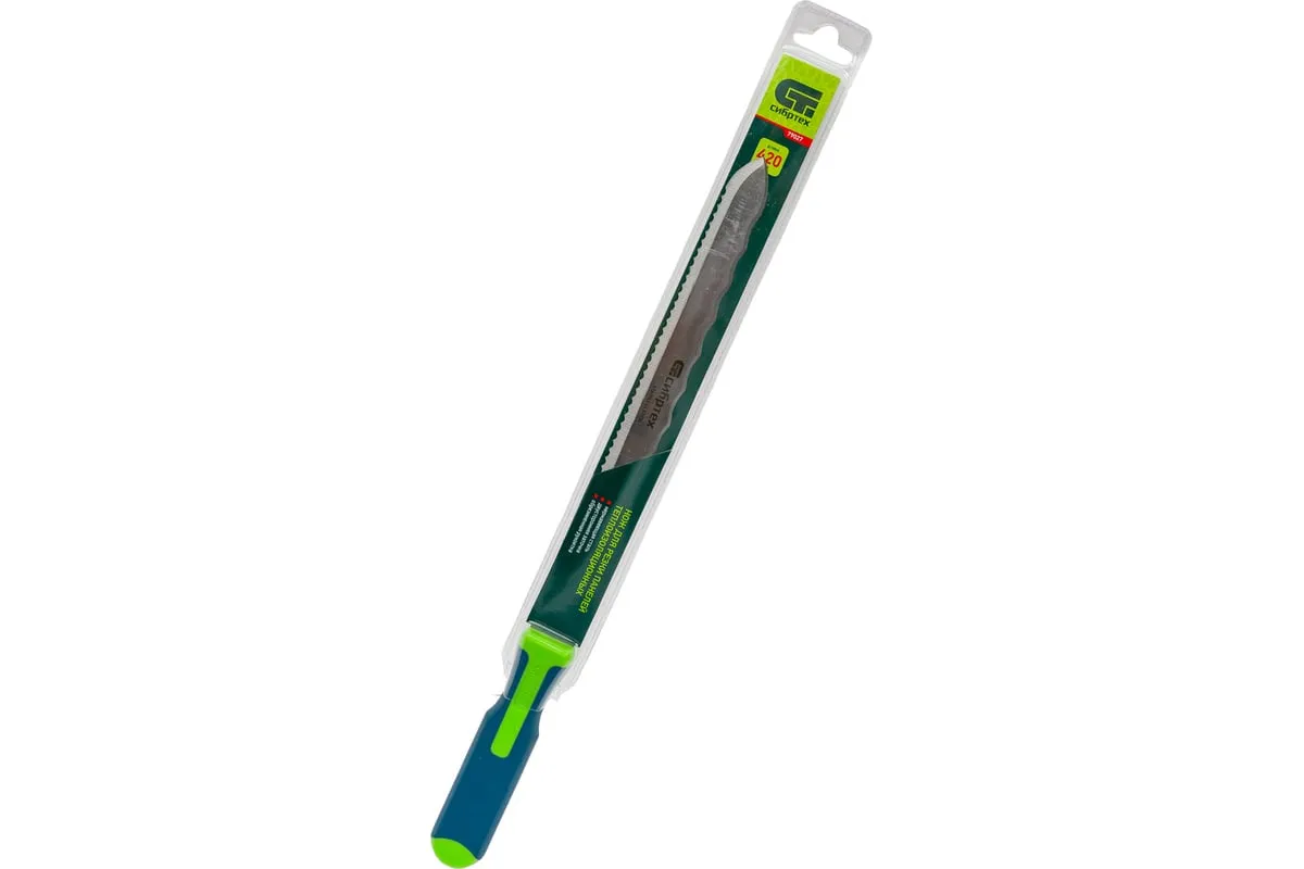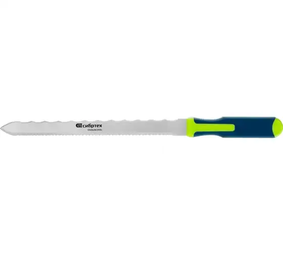 Нож Сибртех 79027 общей длиной 420 мм, с обрезиненной рукояткой и 2-сторонним лезвием длиной 280 мм, используется для резки длинных и толстых теплоизоляционных панелей. Полотно имеет две режущих кромки, что удобно для работы с разными типами материалов.
