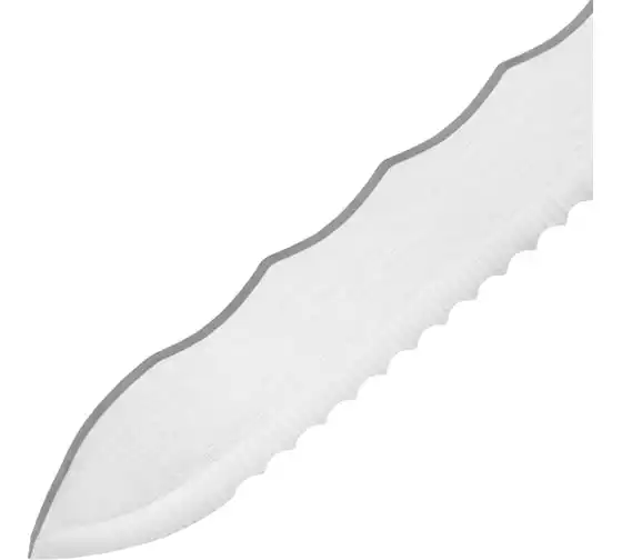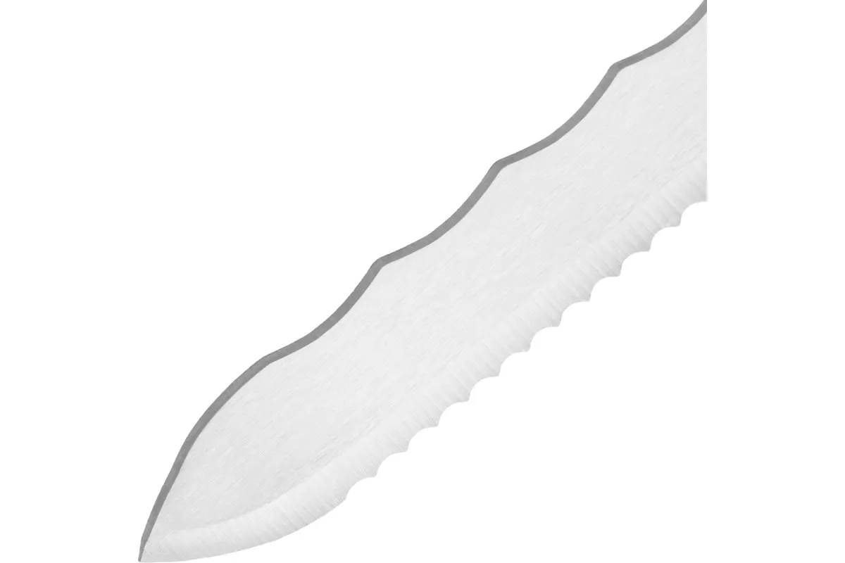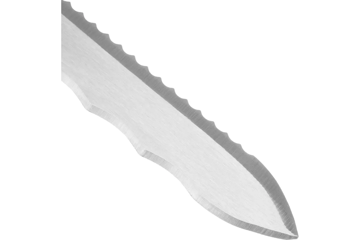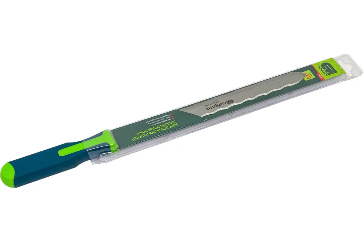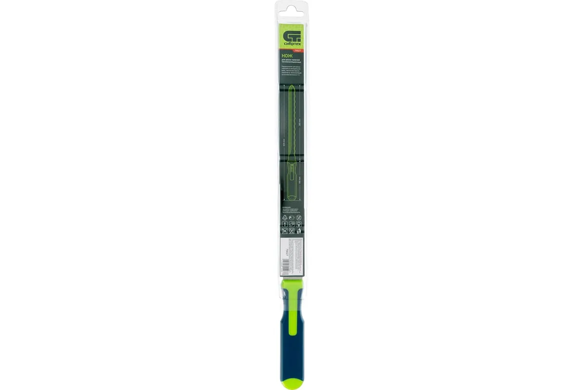 Нож Сибртех 79027 общей длиной 420 мм, с обрезиненной рукояткой и 2-сторонним лезвием длиной 280 мм, используется для резки длинных и толстых теплоизоляционных панелей. Полотно имеет две режущих кромки, что удобно для работы с разными типами материалов.