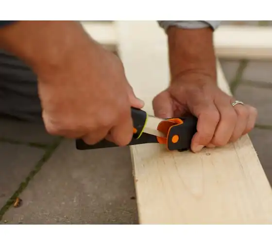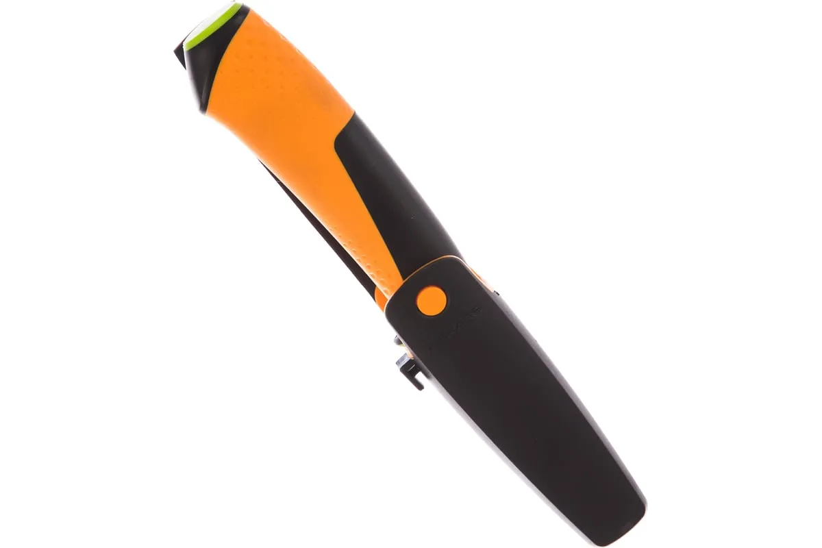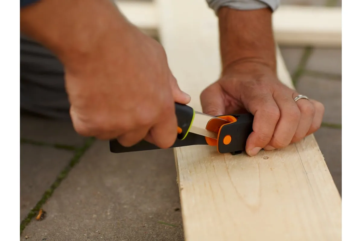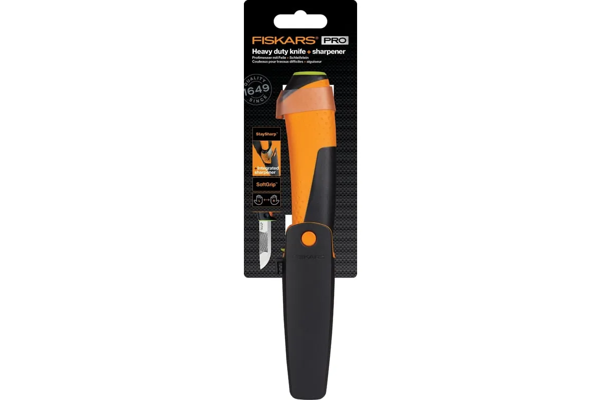Нож для тяжелых работ с точилкой Fiskars 1023619 - это инструмент с удобным хватом, который обеспечивает универсальность использования, его можно брать с собой благодаря чехлу. Лезвие изготовлено из прочной стали, оно затачивается каждый раз при убирании в чехол, так как в нем предусмотрена встроенная точилка. Трехкомпонентная рукоятка обладает контурным покрытием из материала SoftGrip.