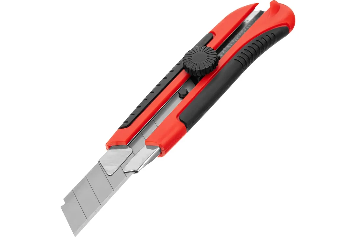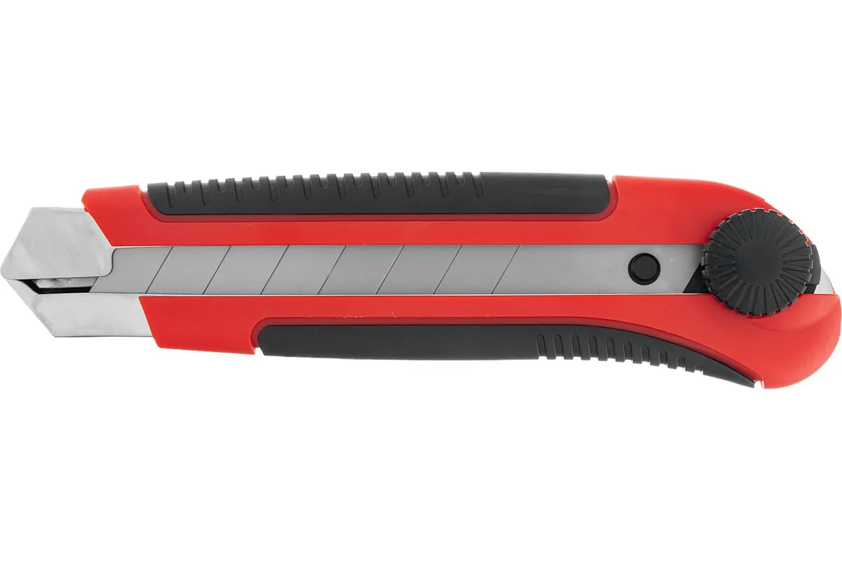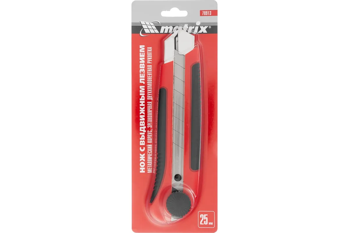 Нож Matrix 78913 в двухкомпонентном корпусе, с выдвижным лезвием шириной 25 мм, металлической направляющей, винтовым фиксатором и магнитом, применяется для разрезания картона, линолеума, ковролина, обоев, пленки, кожи и других мягких материалов. Лезвие выдвигается на необходимую длину и удерживается в этом положении при помощи винтового фиксатора. Нож пригодится во время проведения отделочных и ремонтных работ, а также поможет в решении бытовых задач.