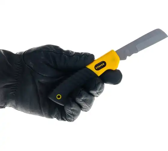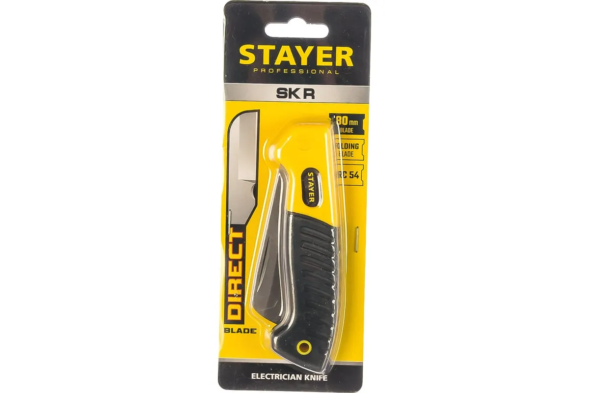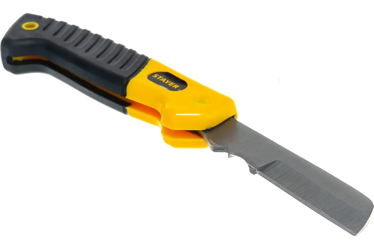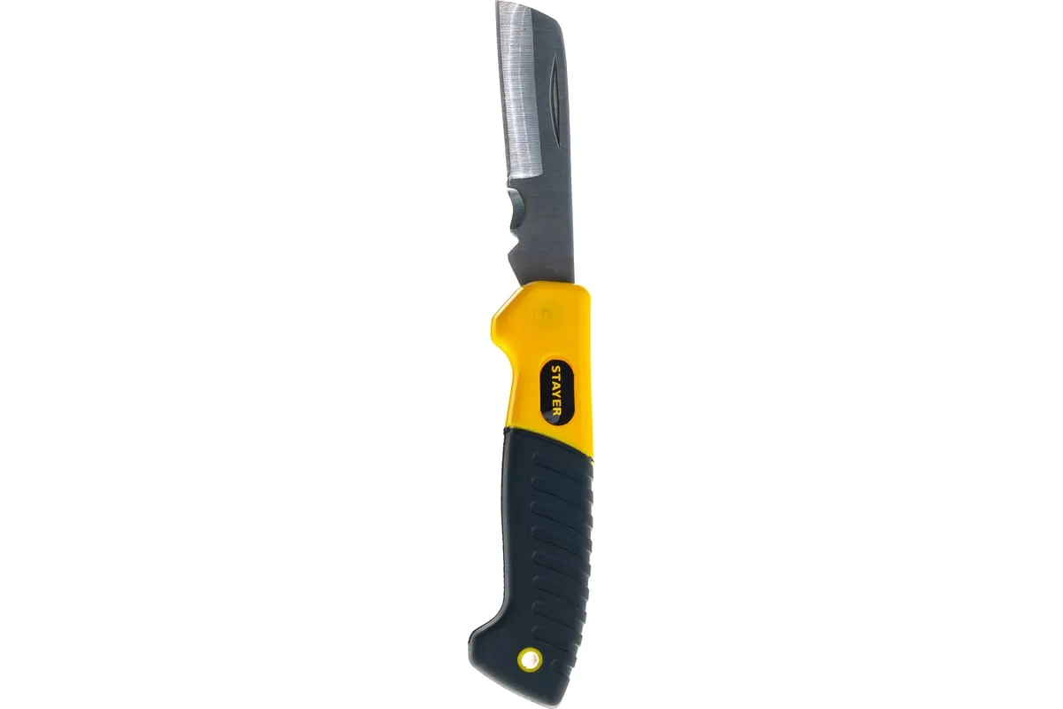 Нож монтерский ПРОФ. Stayer 45408 — профессиональный ручной инструмент для зачистки жил, снятия изоляции и оболочки кабеля. Прямое стальное лезвие для поперечного снятия изоляции отличается высокой прочностью, имеет длину 80 мм, ширину 19 мм. Пластиковая изолированная двухкомпонентная рукоятка с прорезиненной вставкой имеет эргономичную форму и не скользит в руке. Складная конструкция изделия обеспечивает его безопасное хранение и транспортировку. Нож оснащен отверстием для подвешивания и специальной выемкой для поперечного снятия изоляции. Длина изделия в разложенном виде - 205 мм, в сложенном - 125 мм. .