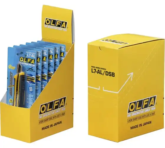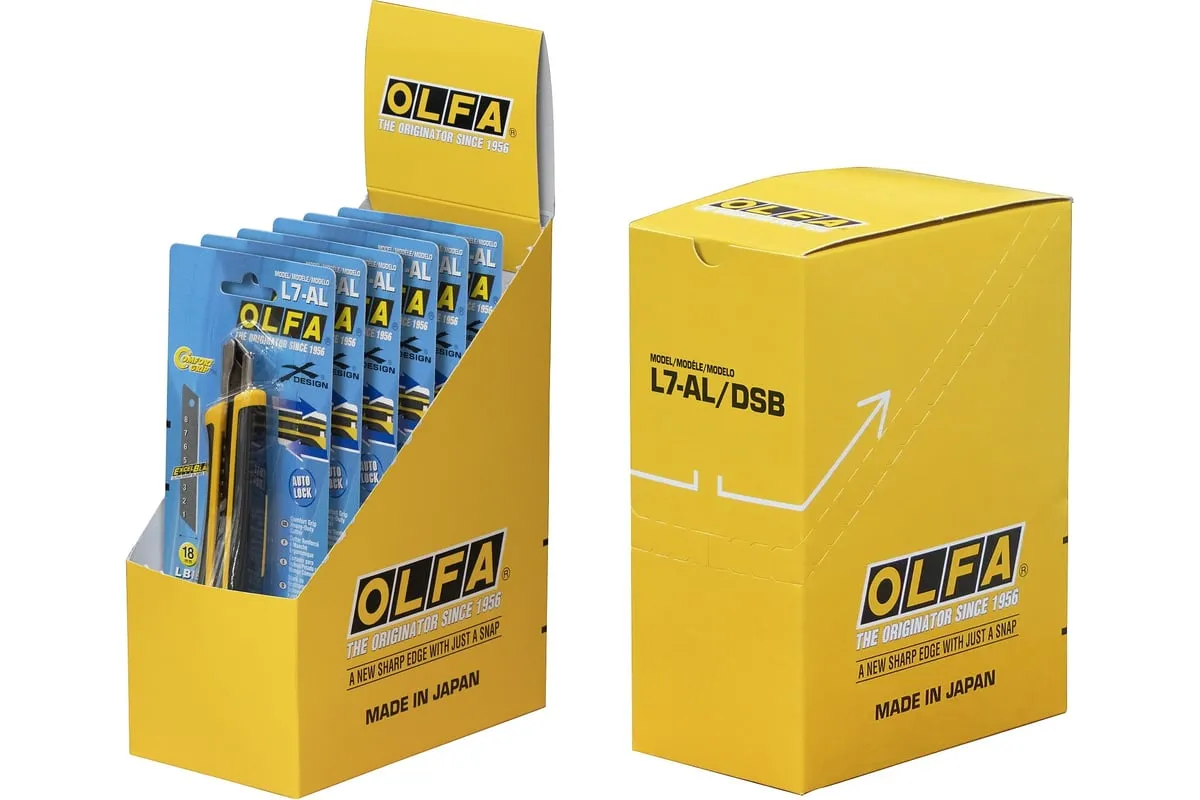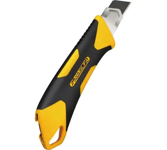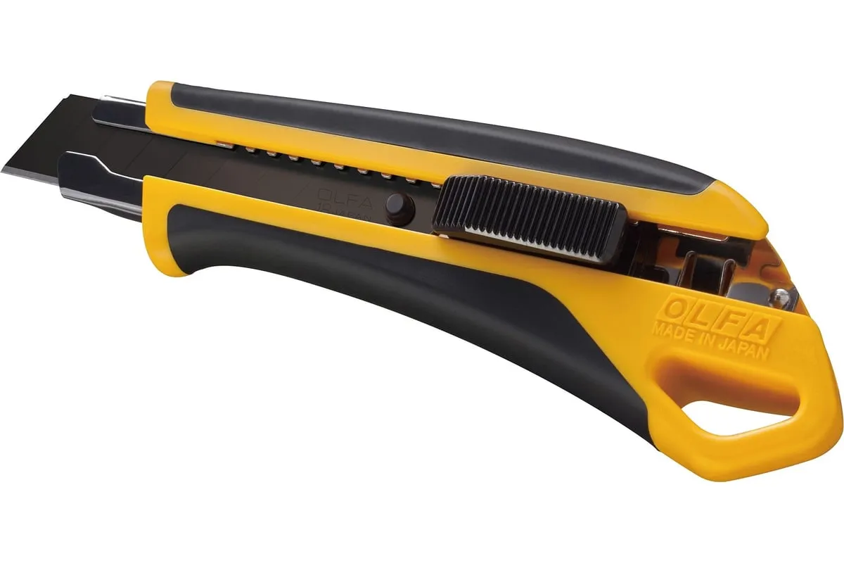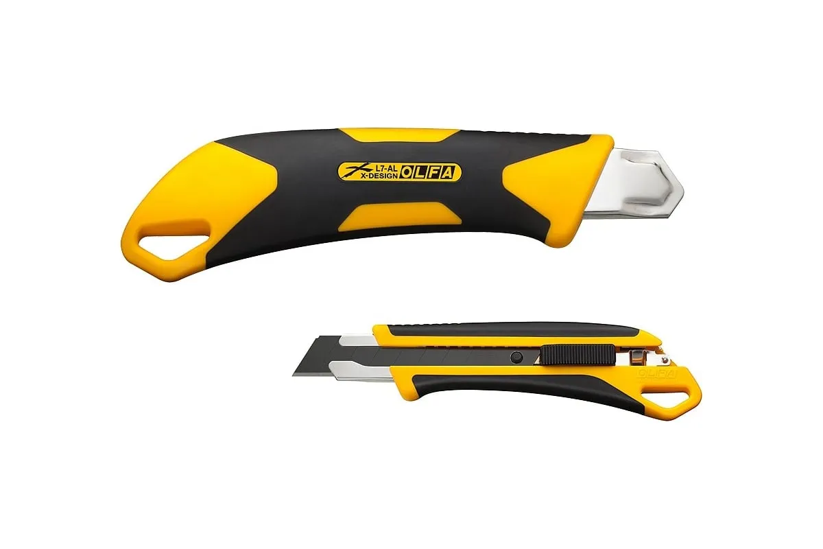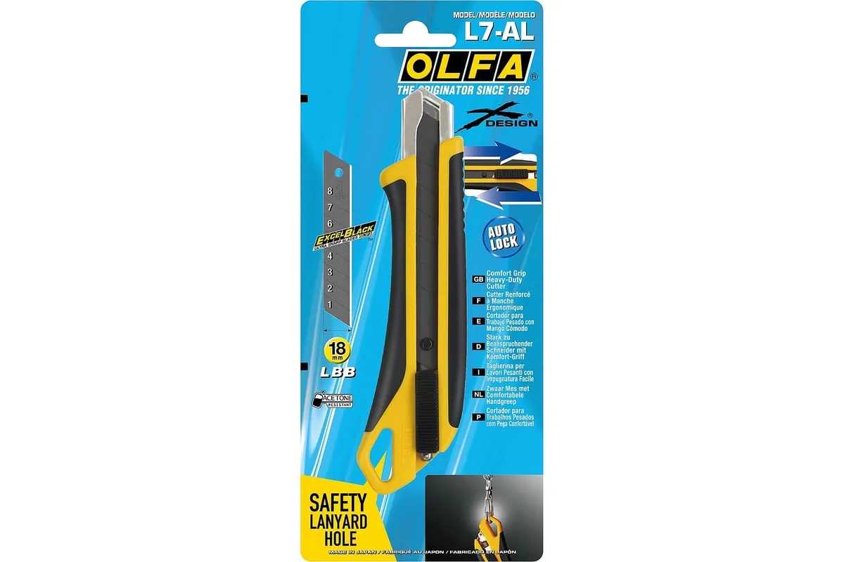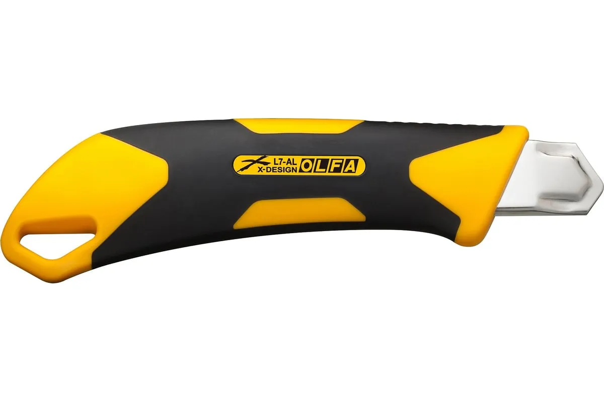 Универсальный нож OLFA L7-AL серии X-design ComfortGrip, с храповым механизмом и металлическим выступом. Легкий и простой в использовании оснащен эргономичнойпротивоскользящей рукояткой устойчивой к кислотам, ацетону и маслам, усиленной фибергласом. Эта комбинация обеспечивает удобный, надежный захват при выполнении самых сложных работ. Имеется отверстие для страховочного шнурка. Отверстие расположено таким образом, чтобы шнурок не мешал работе или замене лезвия. Поставляется с черным лезвием LBB шириной 18 мм, котороена 25% остреестандартных лезвий OLFA. Просто отломите один из восьми сегментов, если лезвие затупилось. Полная замена происходит быстро и без дополнительных инструментов. Универсальный нож OLFA L7-AL предназначен для резки резины, фанеры, кожи, кровельных и прочих жестких материалов. Сверхпрочный нож серии X-design ComfortGrip с автоматической блокировкой.