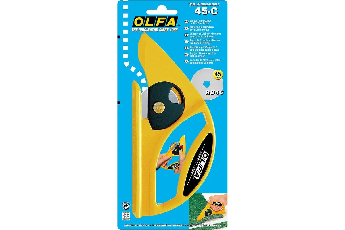 Нож OLFA с круговым лезвием 45 мм OL-45-C: сверхпрочная ручка из ABS-пластика обеспечивает удобный захват даже в перчатках. Прочное плоское основание обеспечивает уверенный рез без повреждений. Поставляется с очень острым лезвием OLFA из вольфрамовой стали диаметром 45 мм. Лезвие надежно зафиксировано в ноже, чтобы обеспечить максимальную эффективность в работе. Каждое лезвие имеет 12 режущих кромок для длительного реза без замены. Если нож затупился, ослабьте винт и слегка поверните лезвие, чтобы получить новую режущую кромку. Также, конструкция винта обеспечивает быструю и эффективную замену лезвия без инструментов.