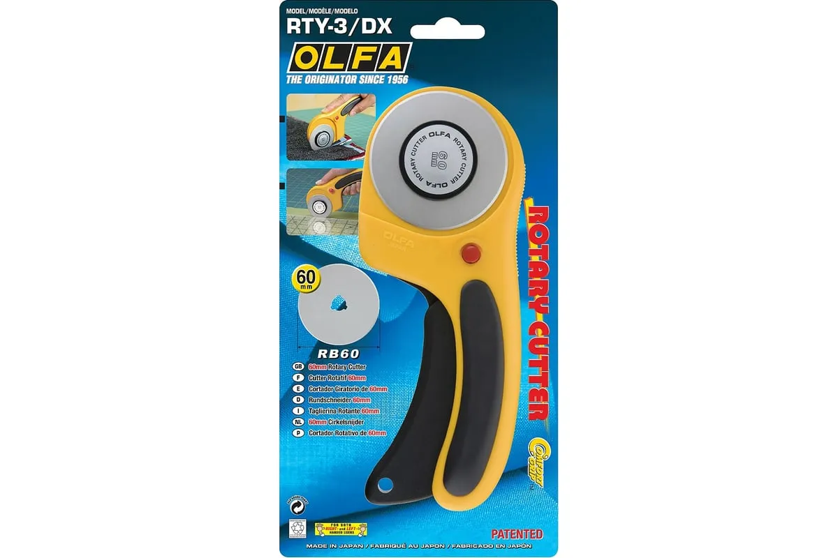 Эргономичный круговой нож OLFA RTY-3/DX может похвастаться высокой производительностью и безопасностью. Идеально подходит и для тонких, и для плотных тканей, включая флис, шерсть, кожу и т. д. Эргономичная рукоятка изогнутой формы снижает нагрузку, удобно лежит в руке благодаря встроенным канавкам и противоскользящему покрытию. Лезвие легко открывается и автоматически убирается в целях безопасности. Фиксатор позволяет заблокировать лезвие в открытом положении для длительной резки или в закрытом положении для безопасного хранения. Возможно использование как правой, так и левой рукой. Поставляется с лезвием OLFA RB60, обеспечивающим вдвое больший объем резки по сравнению со стандартным лезвием. Большой диаметр, 60 мм, разрезает до двенадцати слоев хлопчатобумажной ткани за один проход. Для обеспечения оптимального срока службы лезвия используйте нож OLFA с ковриком OLFA. Он защищает рабочие поверхности, а также продлевает срок службы лезвия. Независимые испытания подтверждают, что лезвия OLFA могут разрезать на 430 метров ткани больше в сочетании с ковриком для резки OLFA.