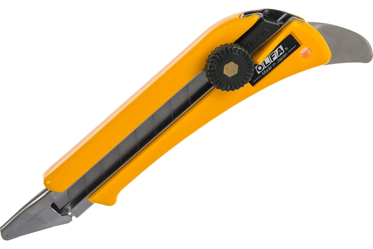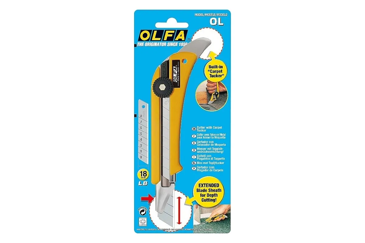 Универсальный нож OLFA OL с увеличенной глубиной реза и храповым механизмом идеально подходит для резки толстых материалов. Оснащен удлиненным каналом из нержавеющей стали, что позволит выдвинуть дополнительные сегменты лезвия — рабочая длина составляет до 4 см. Изготовленная из прочного ABS-пластика противоскользящая рукоятка удобно лежит в руке. На конце ручки имеется специальный металлический выступ для выполнения дополнительных задач, таких как заправка коврового покрытия под плинтус или для снятие фиксирующих ковер скоб, а также вскрытия банок с краской и пр. Поставляется с лезвием LB Silver Snap Blade шириной 18 мм для резки в тяжелых условиях. Восемь сегментов обеспечивают длительную и эффективную работу. Полная замена полотна происходит быстро и без дополнительных инструментов.
