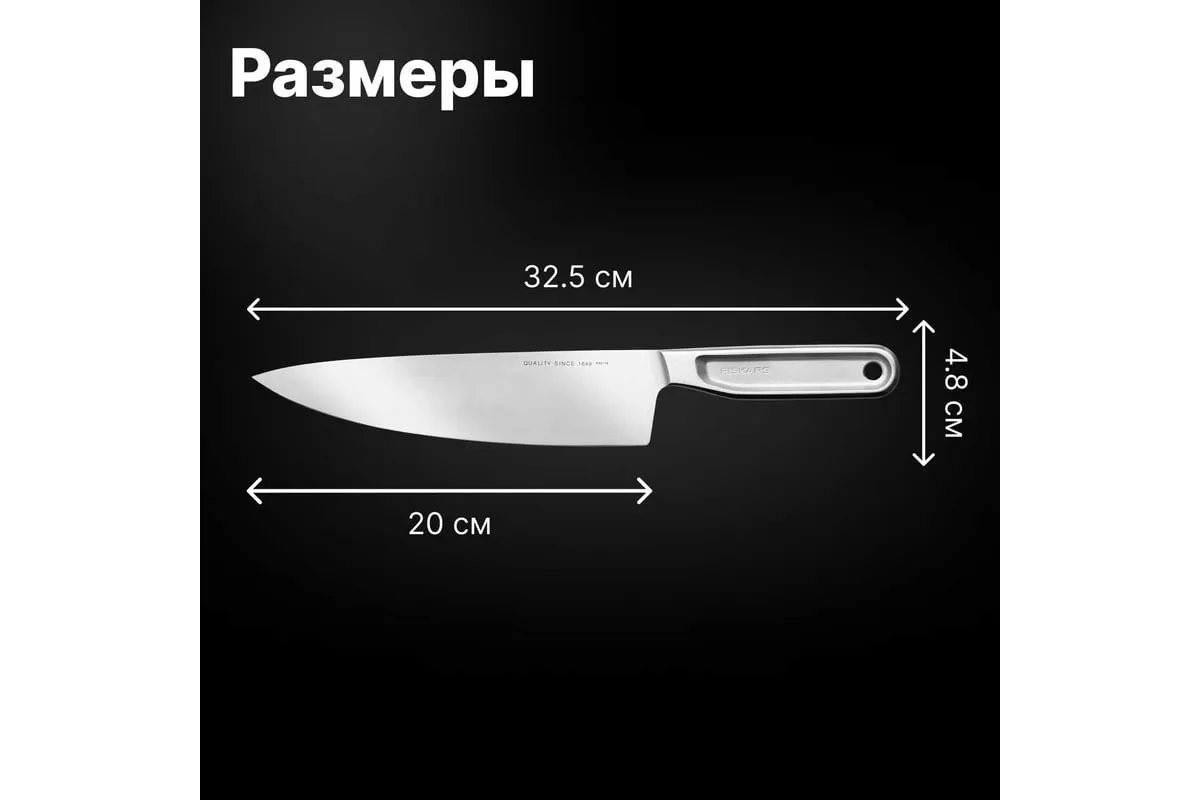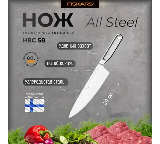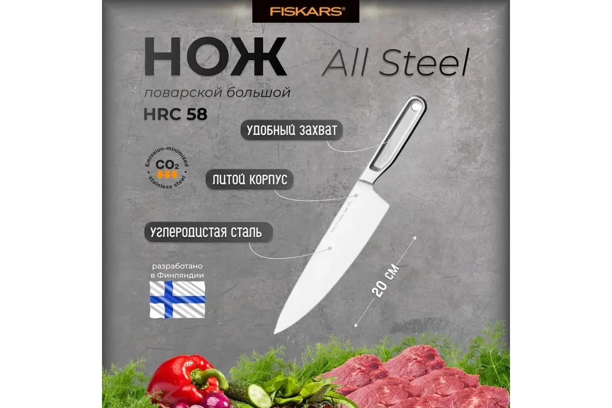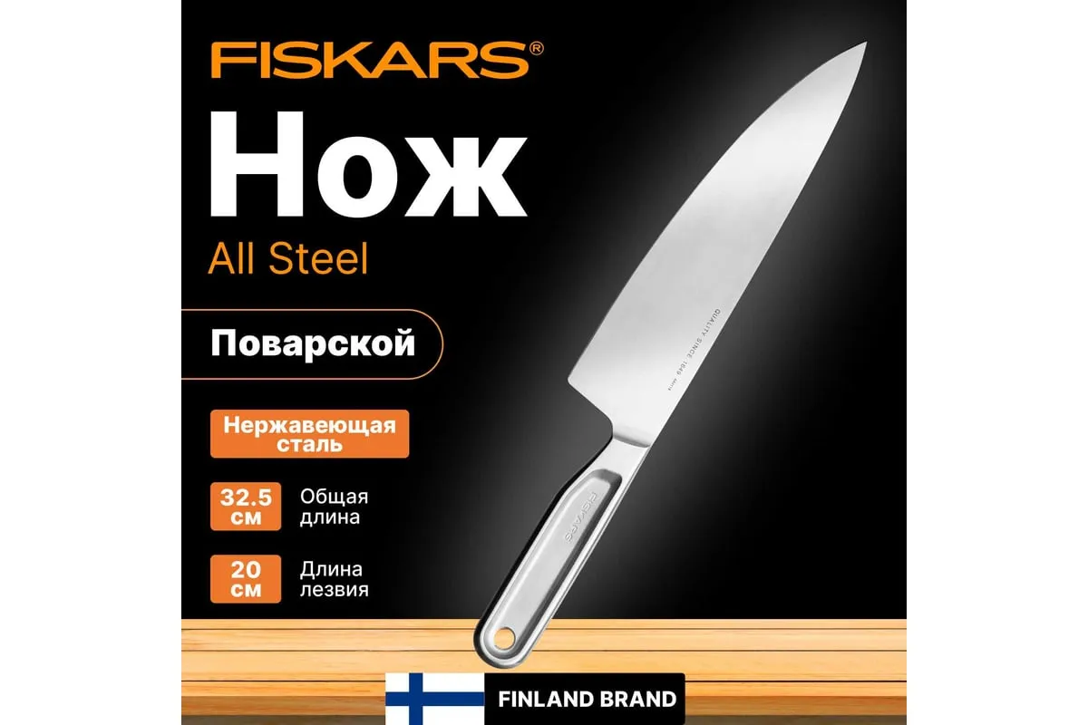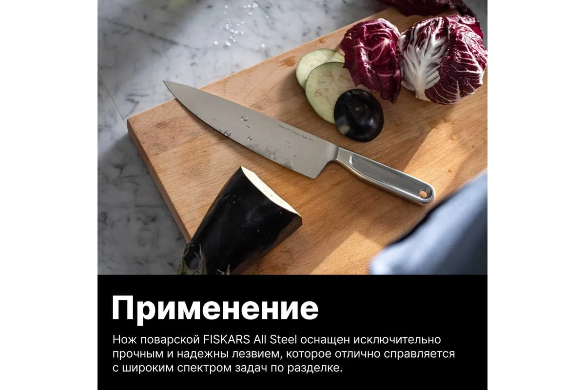 Большой полностью стальной нож шеф-повара Fiskars изготовлен из чистейшей высококачественной нержавеющей стали и рассчитан на высочайшую производительность и долговечность. Он имеет исключительно прочное лезвие, которое отлично подходит для самых разных задач резки.