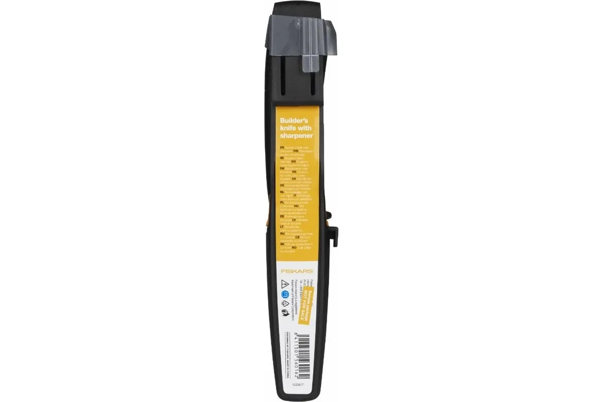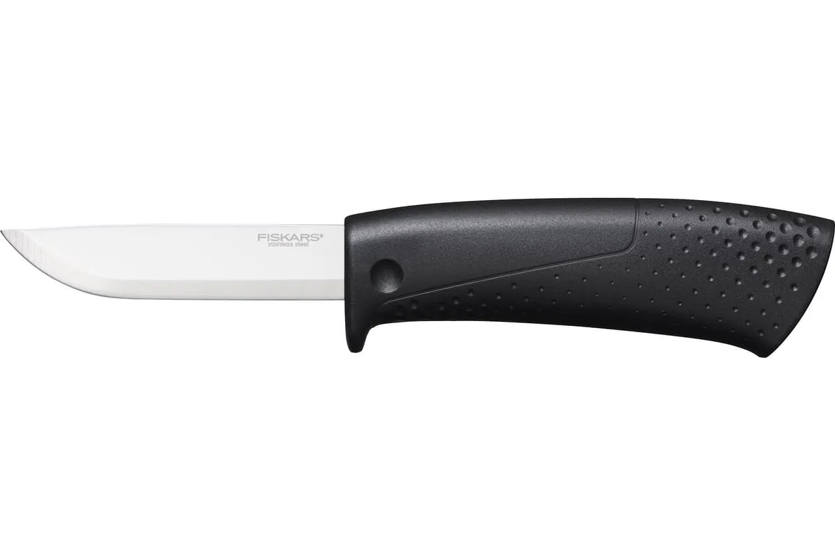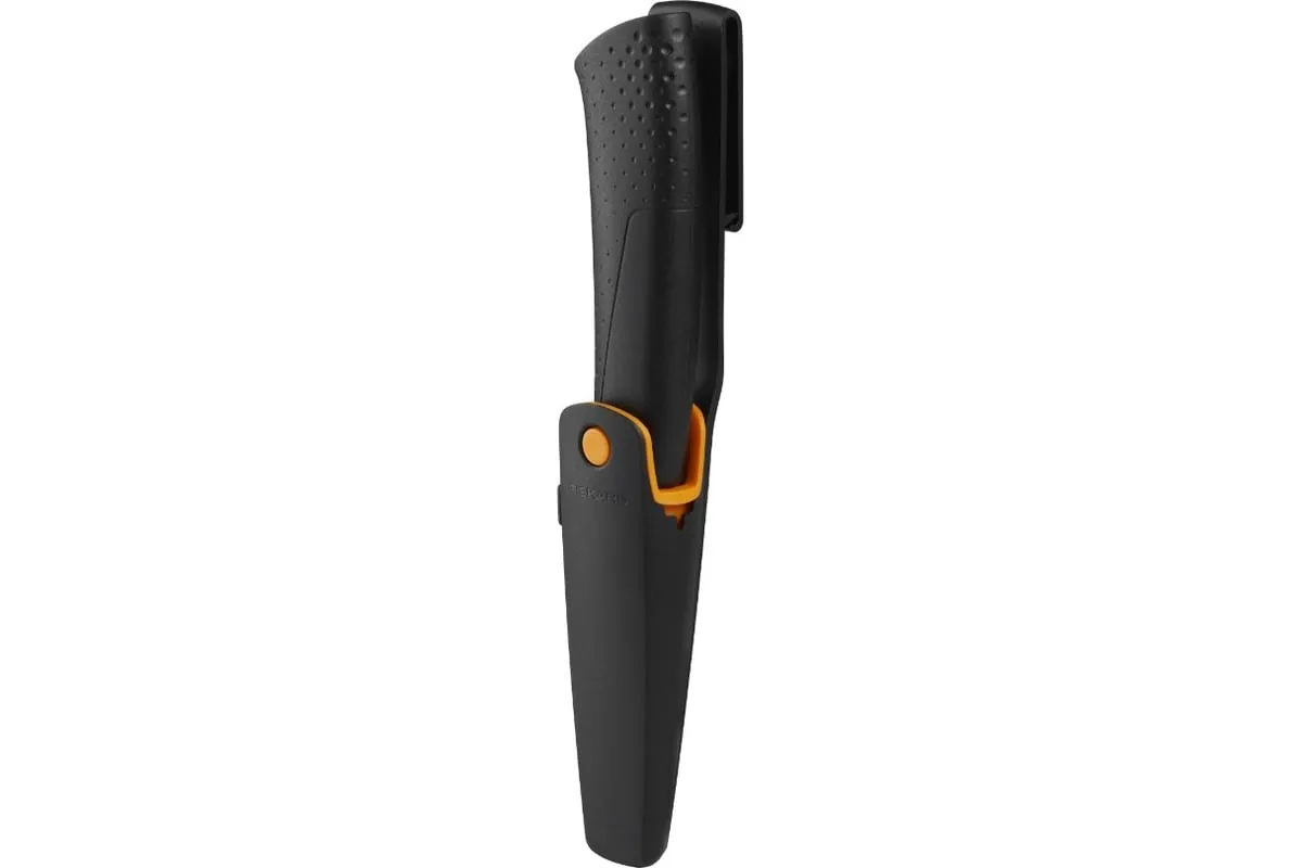 Нож с точилкой Fiskars 1023617 удобен как для правшей, так и для левшей. Лезвие выполнено из нержавеющей стали, благодаря чему инструмент прослужит долго. Предусмотрена клипса для крепления ножа на ремень.