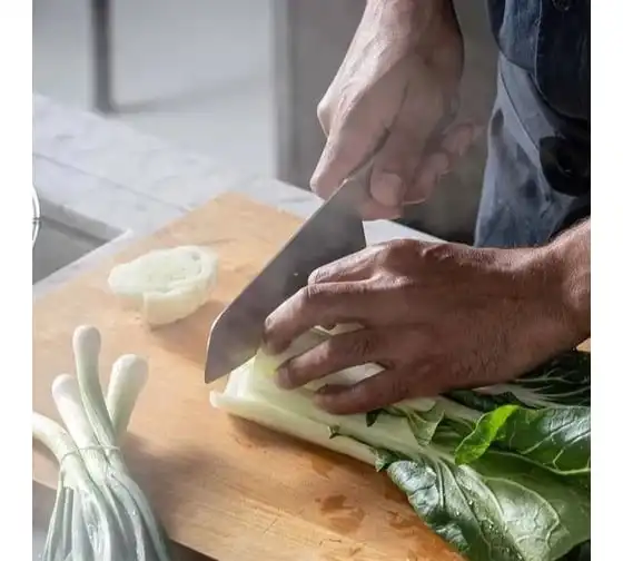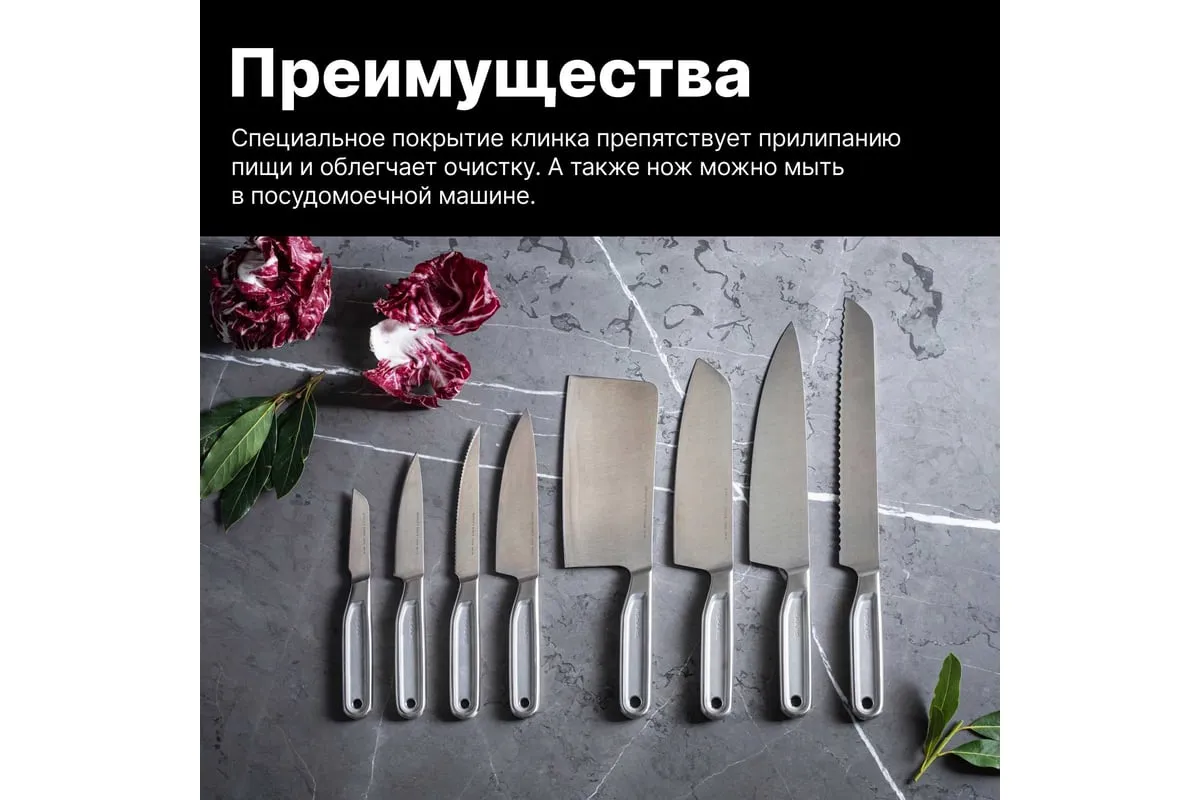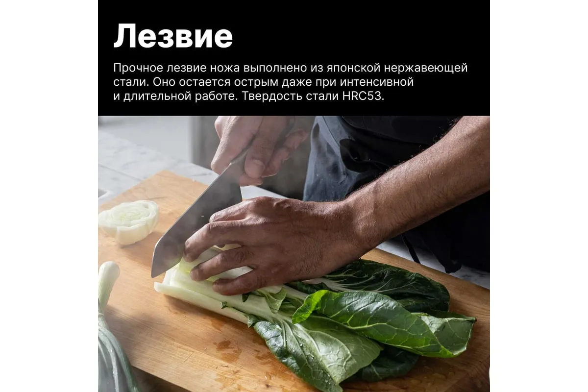 Широкое лезвие идеально подходит для приготовления мяса, рыбы, овощей и многого другого.