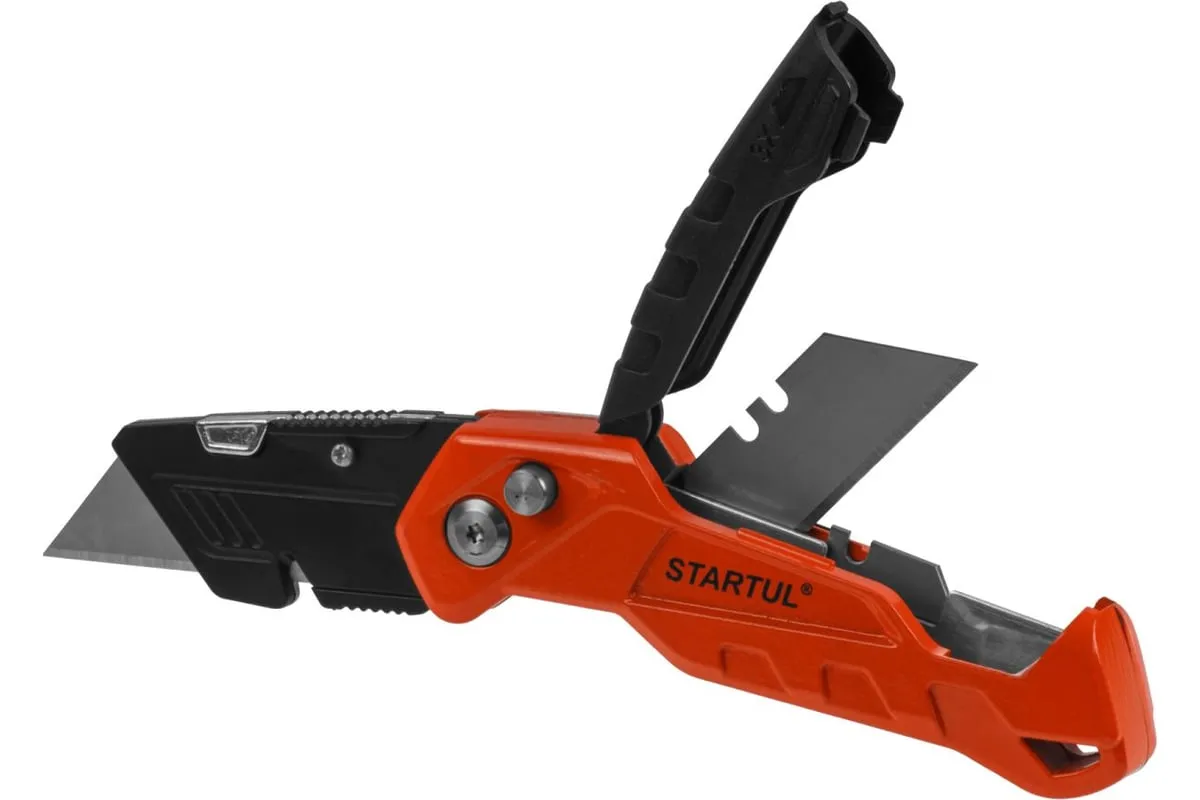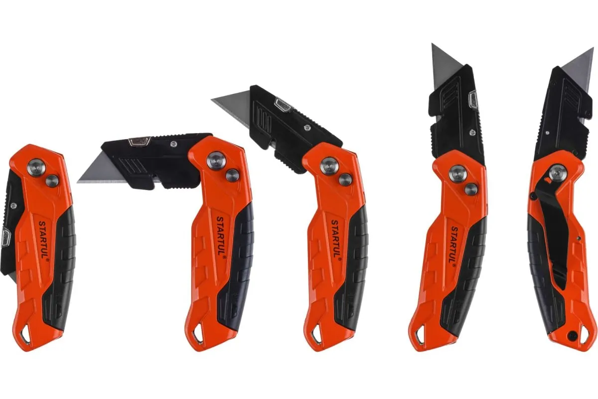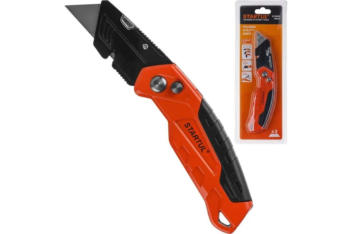 Нож универсальный складной 19 мм STARTUL Profi (ST0950) - нож универсальный со сменным трапециевидным лезвием. Предназначен для разрезания бумаги, картона, линолеума, кожи, гипсокартона и прочих материалов. Материал лезвия: инструментальная высокоуглеродистая сталь SK5. 3 сменных трапециевидных лезвия в комплекте.