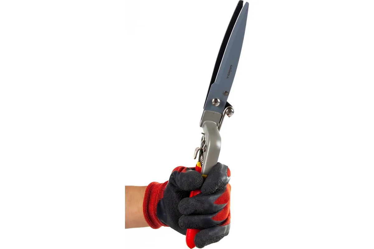 Ножницы для стрижки травы GRINDA 8-422003_z01 - эффективный садовый инструмент для ухода за газонами, подравнивания травы вдоль дорожек и в цветниках. Лезвия выполнены из высококачественной углеродистой стали, закалены для прочности и остро заточены. Тефлоновое покрытие предотвращает коррозию и препятствует налипанию грязи на лезвия. Рукоятки оснащены специальными накладками из ПВХ, которые обеспечивают более надежный хват.
