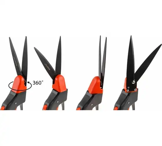 Ножницы оснащены поворотной рабочей частью и расположенным сверху фиксатором.