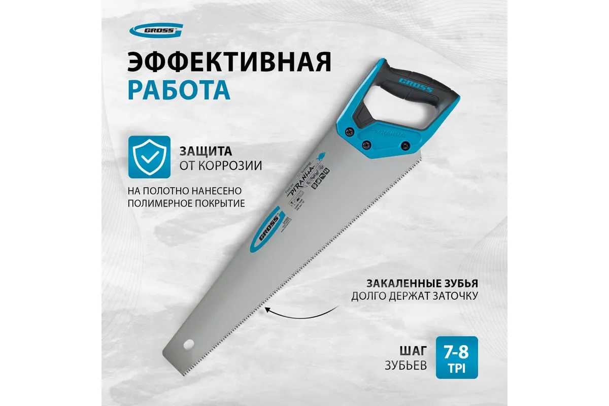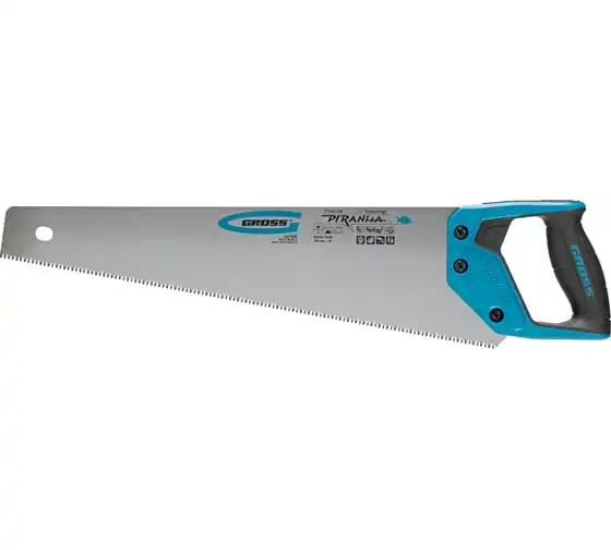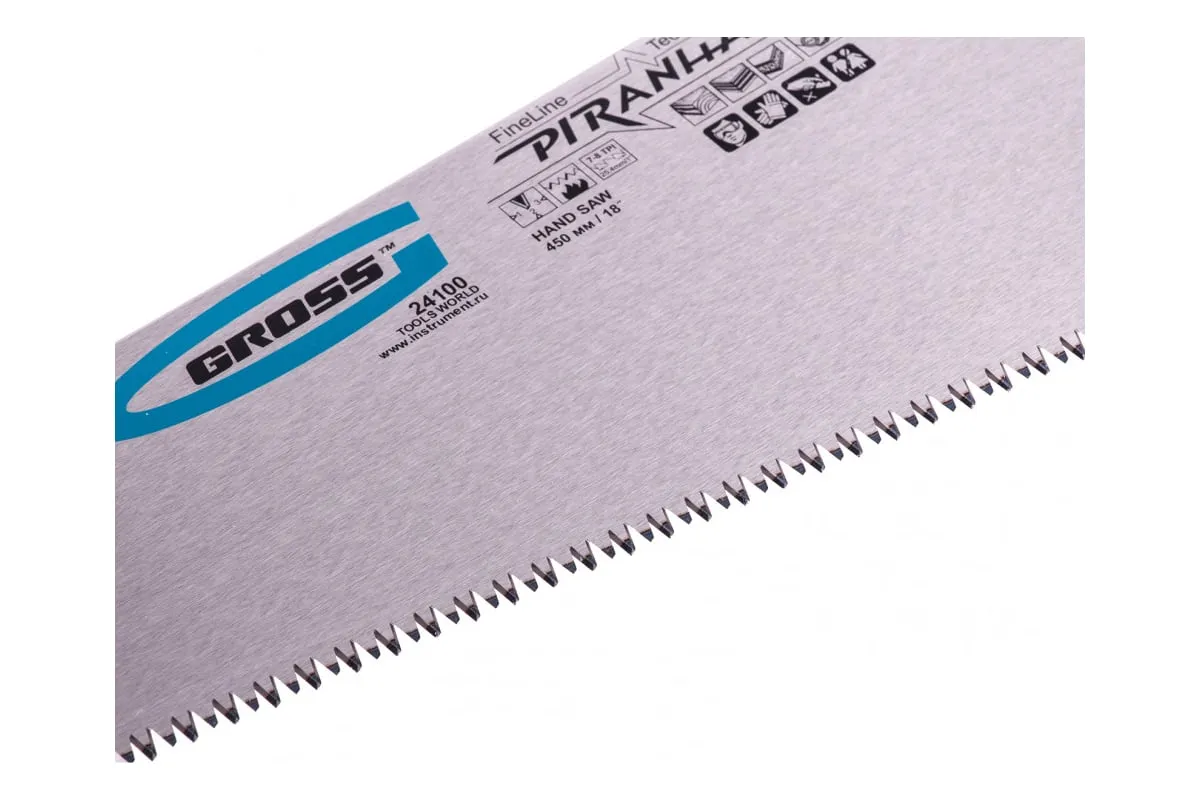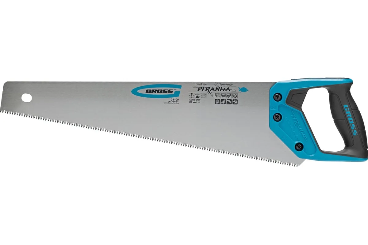 Ножовка по дереву 450 мм GROSS PIRANHA 24100 с полотном длиной 450 мм, калеными зубьями с 3D-заточкой и шагом 7-8 TPI, с 2-компонентной рукояткой, используется для распиливания древесины, МДФ, ДСП, ДВП, ламината, а также пенополистирола, полиуретана и других пластических материалов. Подходит для продольного и поперечного пиления. Зубья имеют универсальный шаг 7-8 TPI, поэтому ножовка подходит для решения широкого спектра задач. Трехгранная заточка зубьев обеспечивает максимальную производительность и высокое качество пиления. Ножовка предназначена для столярных и плотницких работ, пригодится во время ремонта и будет полезна в быту.