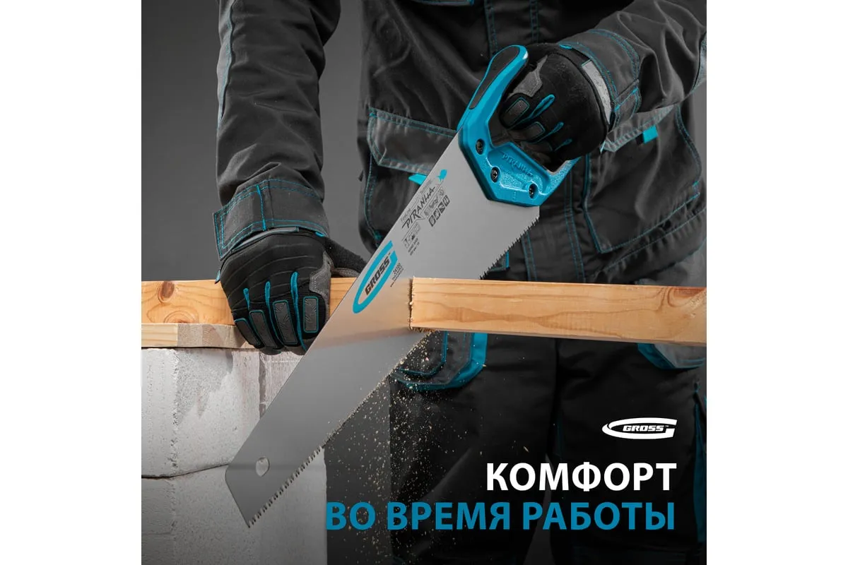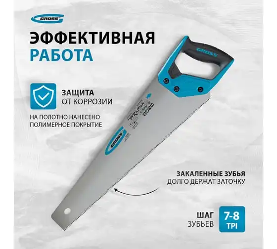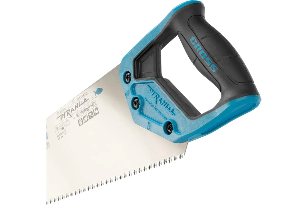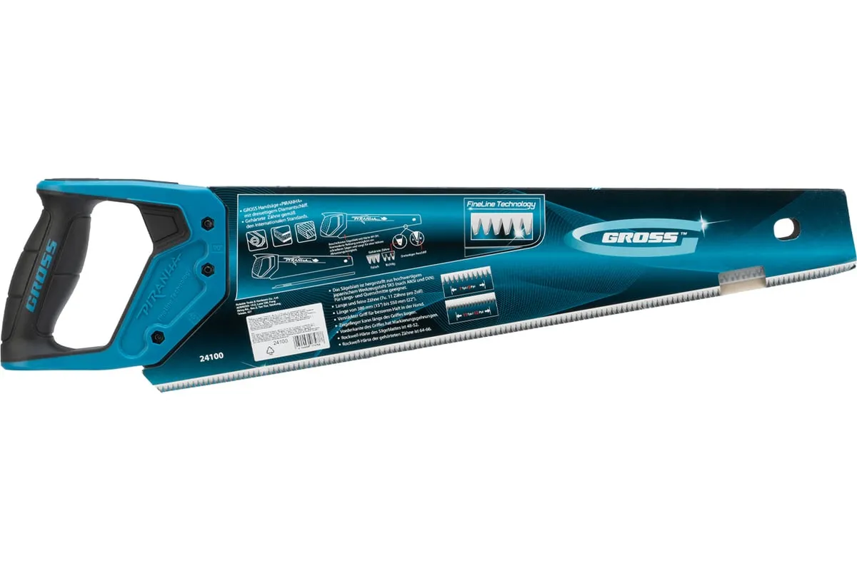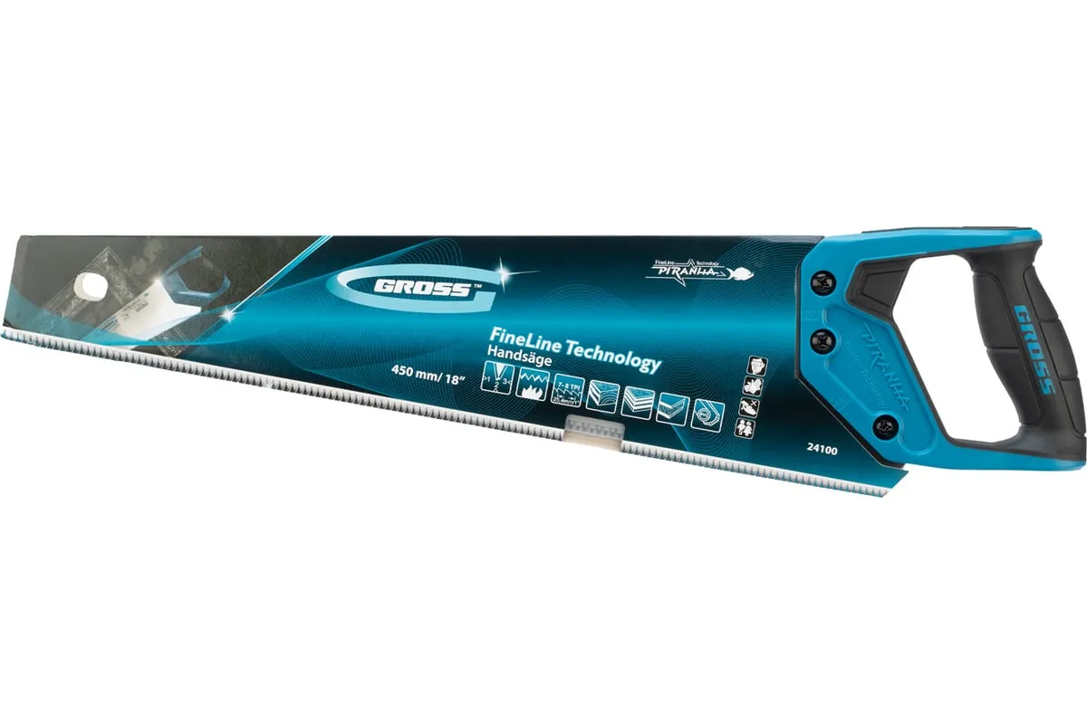 Ножовка по дереву 450 мм GROSS PIRANHA 24100 с полотном длиной 450 мм, калеными зубьями с 3D-заточкой и шагом 7-8 TPI, с 2-компонентной рукояткой, используется для распиливания древесины, МДФ, ДСП, ДВП, ламината, а также пенополистирола, полиуретана и других пластических материалов. Подходит для продольного и поперечного пиления. Зубья имеют универсальный шаг 7-8 TPI, поэтому ножовка подходит для решения широкого спектра задач. Трехгранная заточка зубьев обеспечивает максимальную производительность и высокое качество пиления. Ножовка предназначена для столярных и плотницких работ, пригодится во время ремонта и будет полезна в быту.