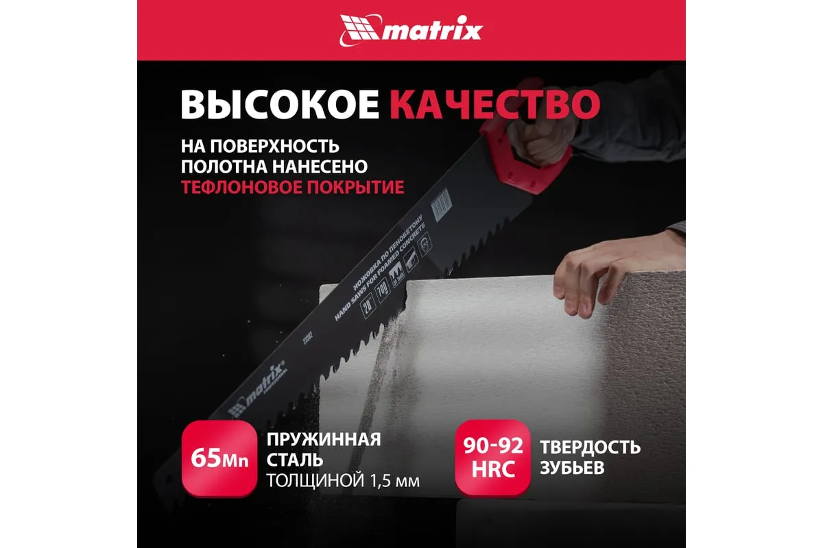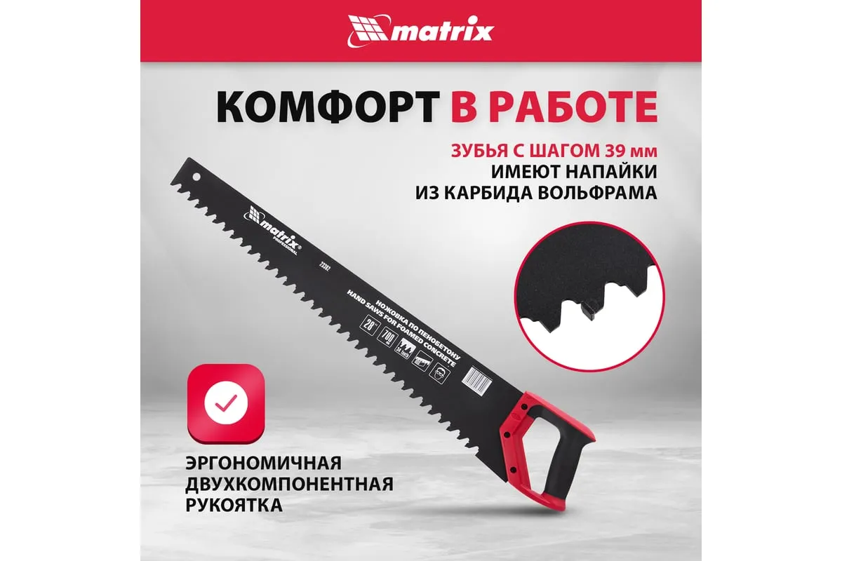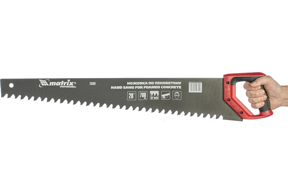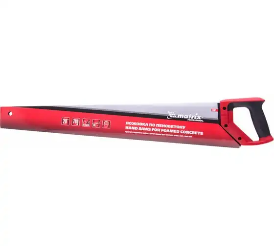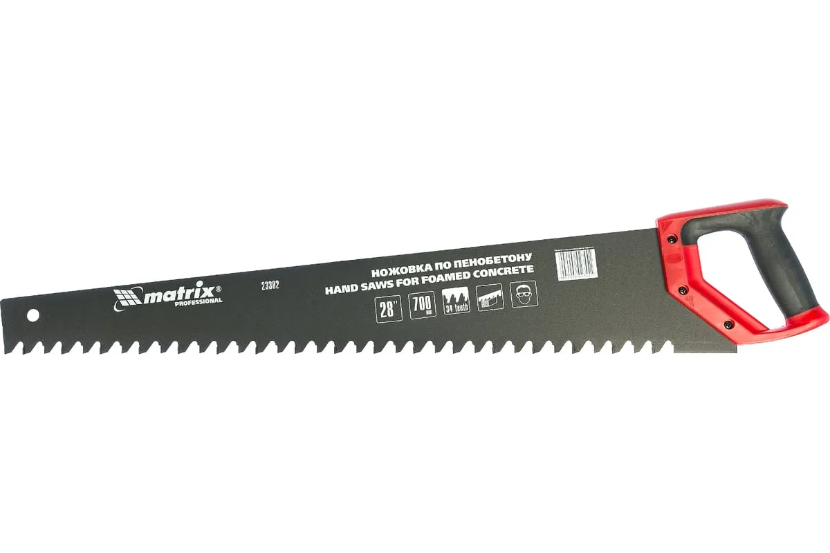 Ножовка по пенобетону 700 мм MATRIX 23382 служит для распила заготовок, может применяться на строительных площадках или в ремонтных мастерских. Инструмент имеет твердосплавные напайки из карбида вольфрама, а также специальный угол заточки зубьев, что и позволяет совершать аккуратный чистый рез. Тефлоновое покрытие защищает от коррозии. Двухкомпонентная рукоять не скользит в руке.
