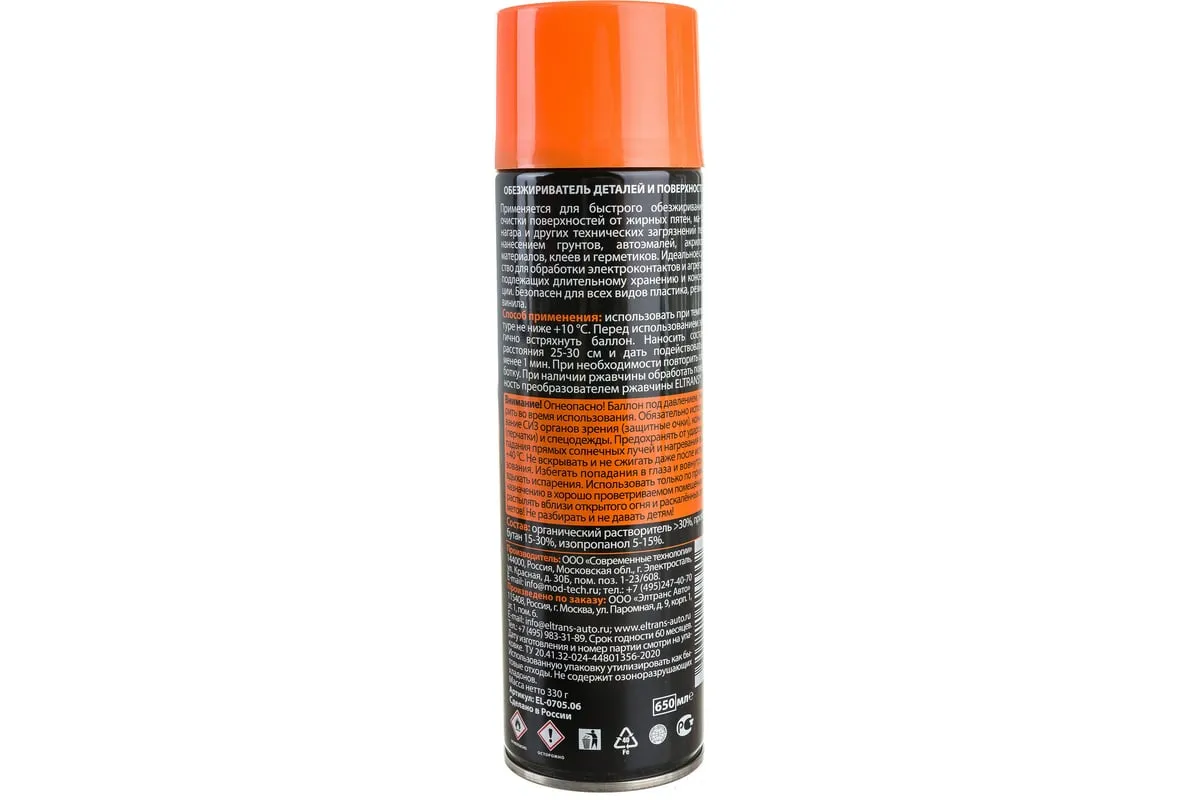 Обезжириватель деталей и поверхностей ELTRANS аэрозоль, 650 мл EL-0705.06 эффективно удаляет жирные и масляные пятна, нагар и большинство технических загрязнений. Состав абсолютно безопасен для резины, винила и всех видов пластмассы.