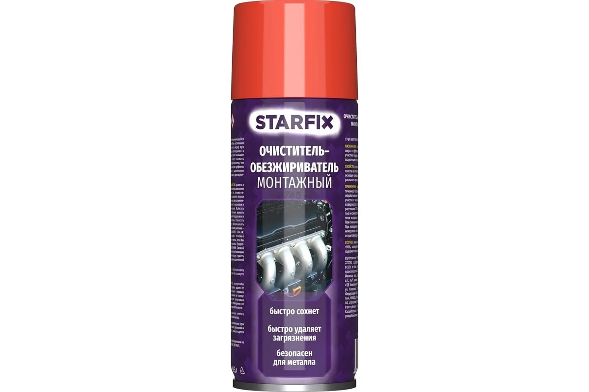 Очиститель-обезжириватель монтажный STARFIX 650 мл (SM-68652-1) предназначен для быстрого удаления масла, жира и эффективной очистки загрязненных участков перед окрашиванием, грунтованием, сварочными и другими работами. Объём аэрозольного баллона 650 мл.