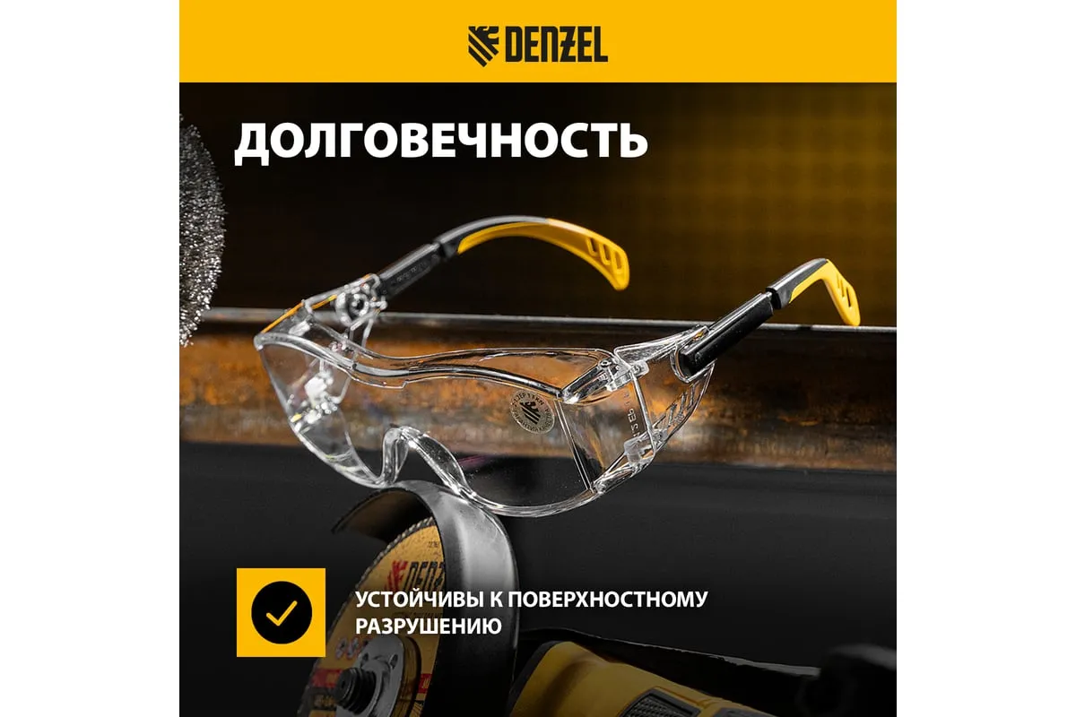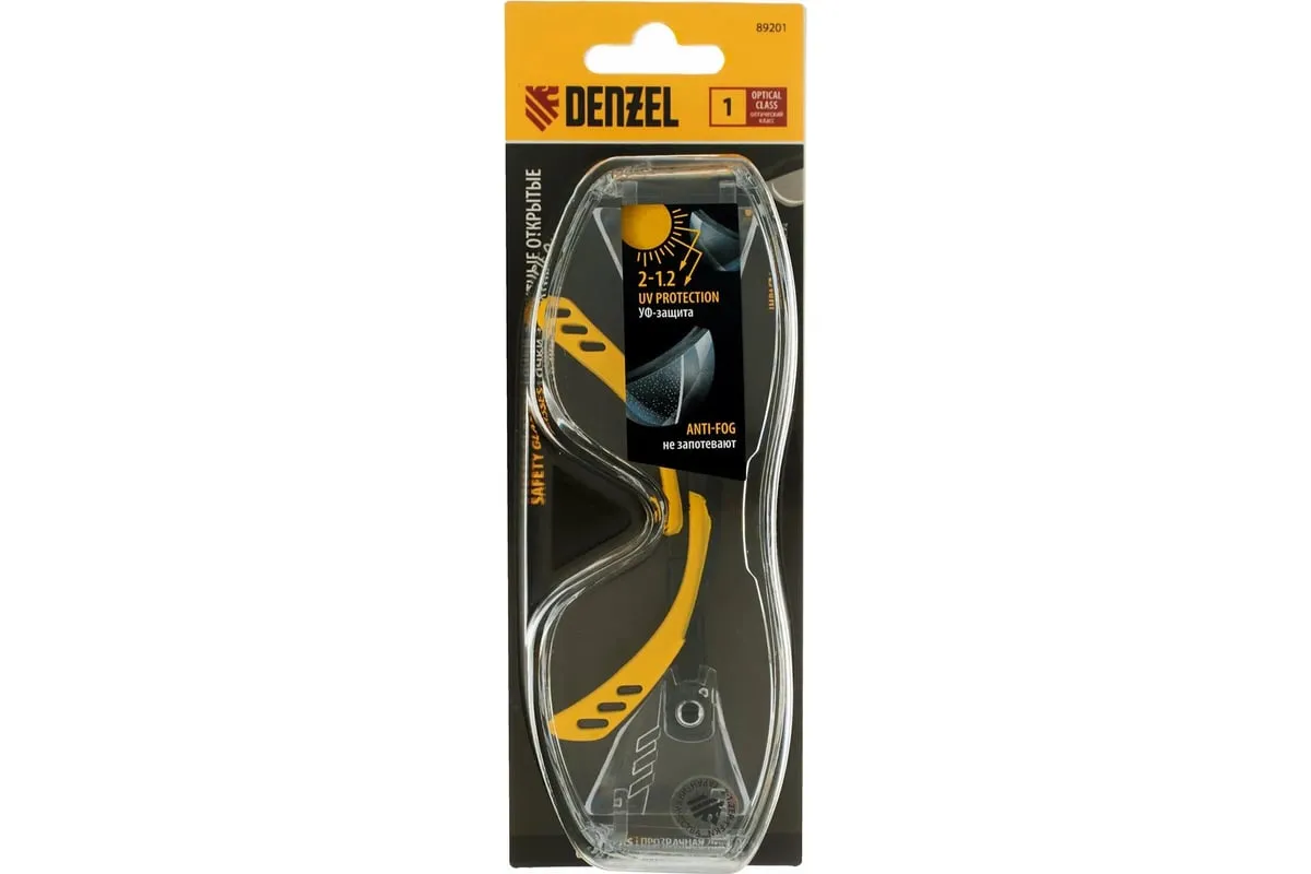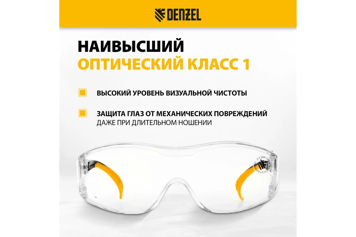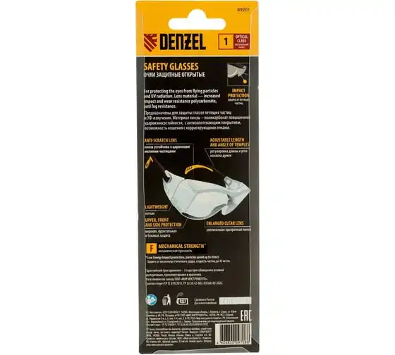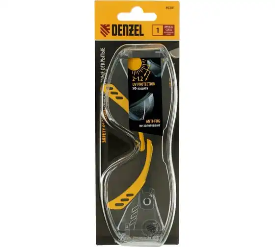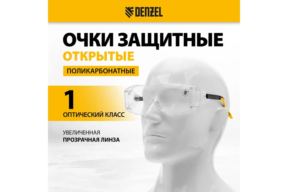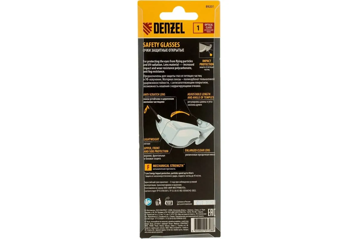Очки защитные открытые Denzel 89201 с увеличенными поликарбонатными прозрачными линзами и регулируемыми дужками предназначены для защиты глаз от механических повреждений и УФ-излучения. Очкам присвоен класс механической прочности F, они обеспечивают защиту от высокоскоростных частиц с низкоэнергетическим ударом (скорость частиц до 45 м/с).