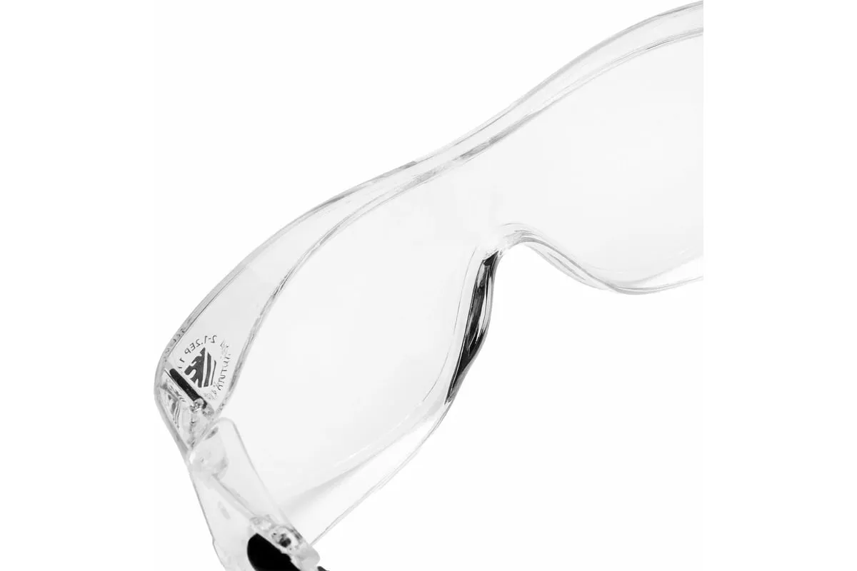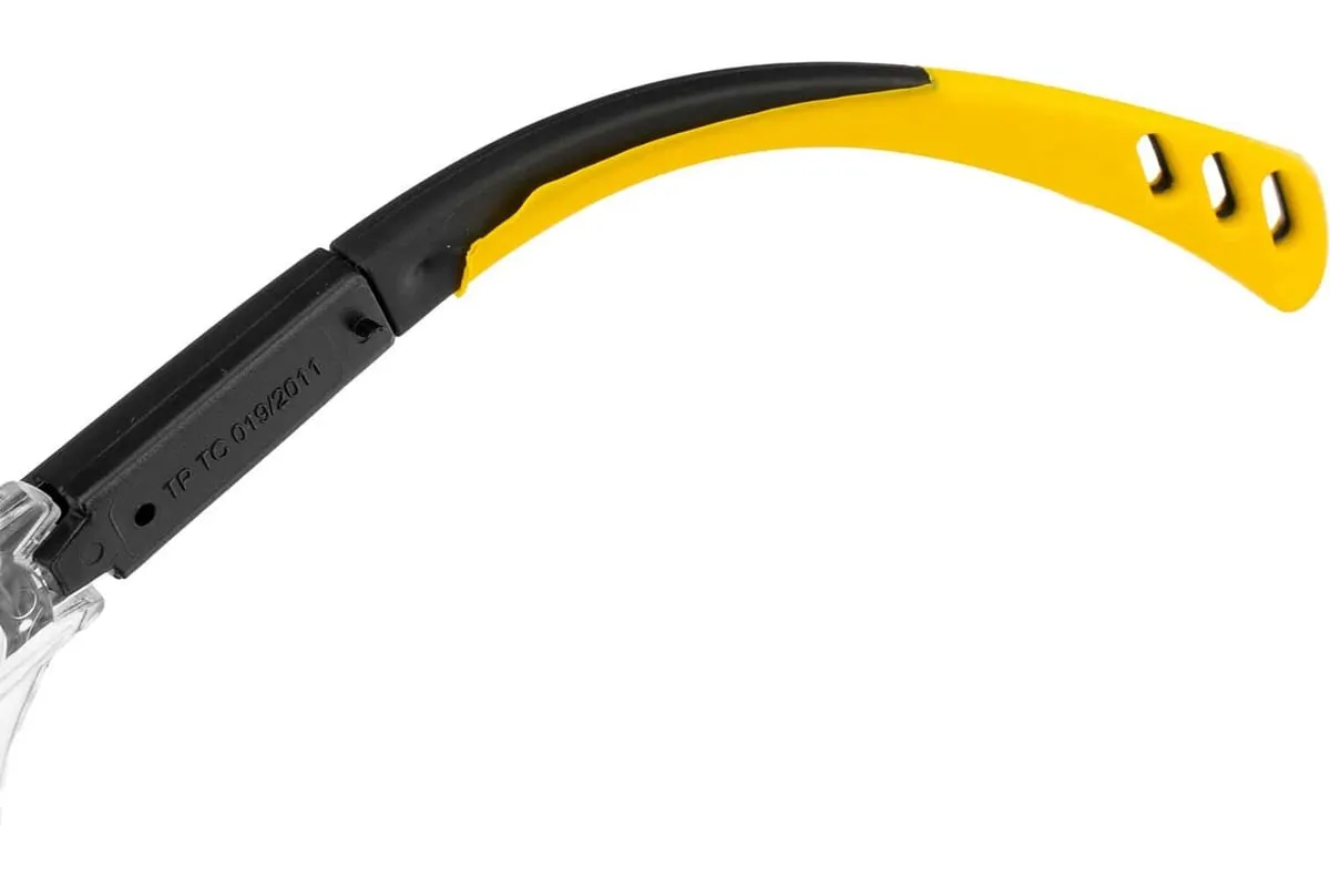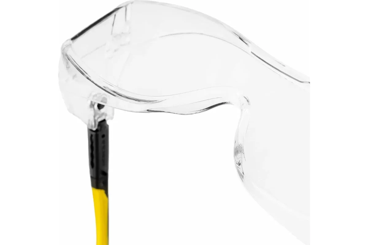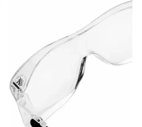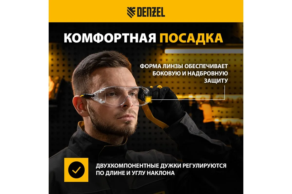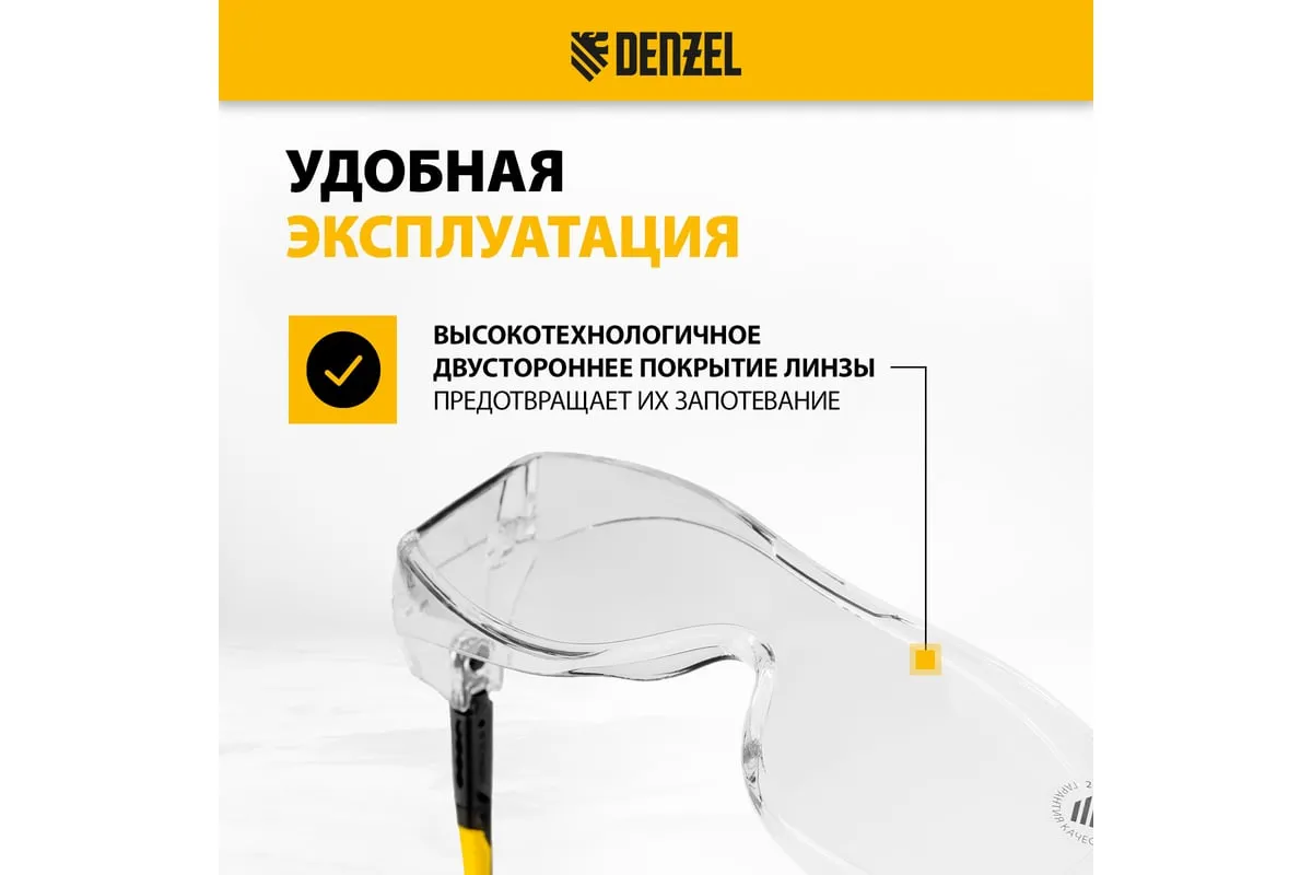 Очки защитные открытые Denzel 89201 с увеличенными поликарбонатными прозрачными линзами и регулируемыми дужками предназначены для защиты глаз от механических повреждений и УФ-излучения. Очкам присвоен класс механической прочности F, они обеспечивают защиту от высокоскоростных частиц с низкоэнергетическим ударом (скорость частиц до 45 м/с).