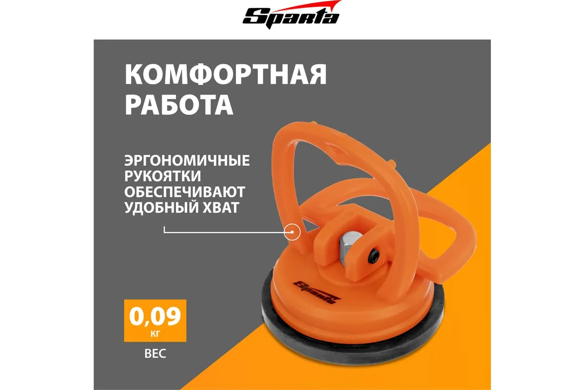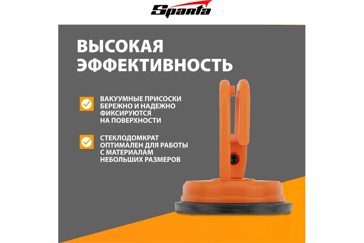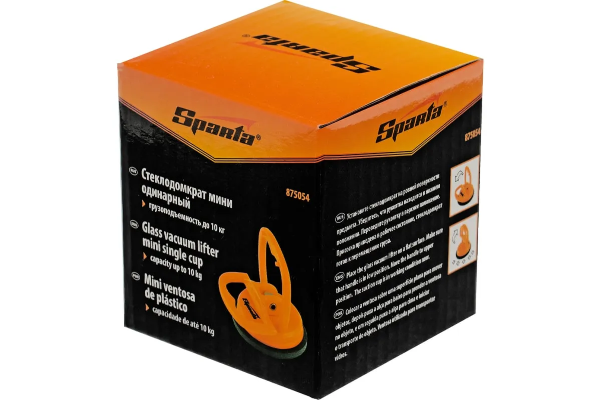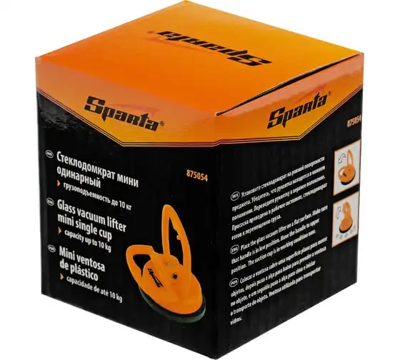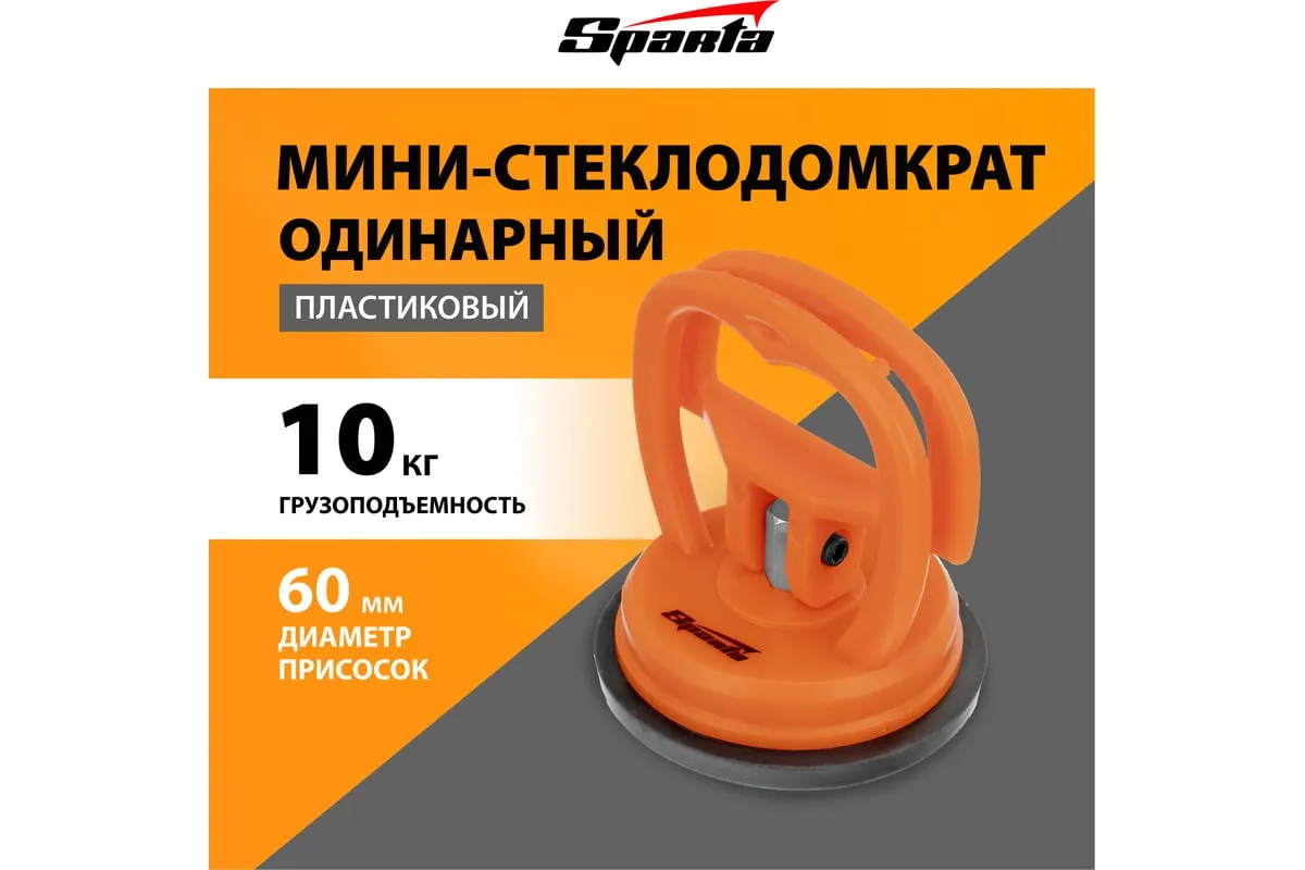 Одинарный мини стеклодомкрат Sparta 875054 служит для захвата, удержания и перемещения стекол, зеркал, кафельной плитки и других гладких материалов весом до 10 кг. Имеет вакуумную присоску, которая после складывания рукоятки бережно прижимается к чистой сухой поверхности и прочно фиксируется на ней. Инструмент пригодится во время ремонтных и отделочных работ.