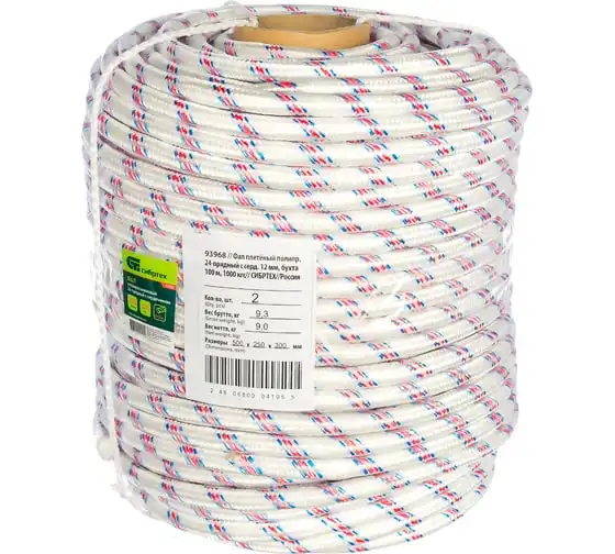 Плетеный 24-прядный полипропиленовый фал с сердечником 12мм, бухта 100м, 1000кгс СИБРТЕХ Россия 93968