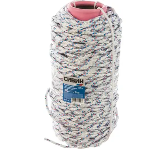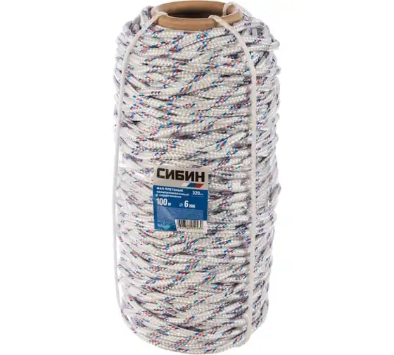 Плетёный полипропиленовый 16-прядный фал с полипропиленовым сердечником, диаметр 6мм, бухта 100м, 320кгс СИБИН 50215-06