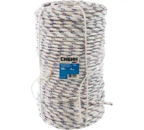 Плетёный полипропиленовый 16-прядный фал с полипропиленовым сердечником, диаметр 8мм, бухта 100м, 520кгс СИБИН 50215-08