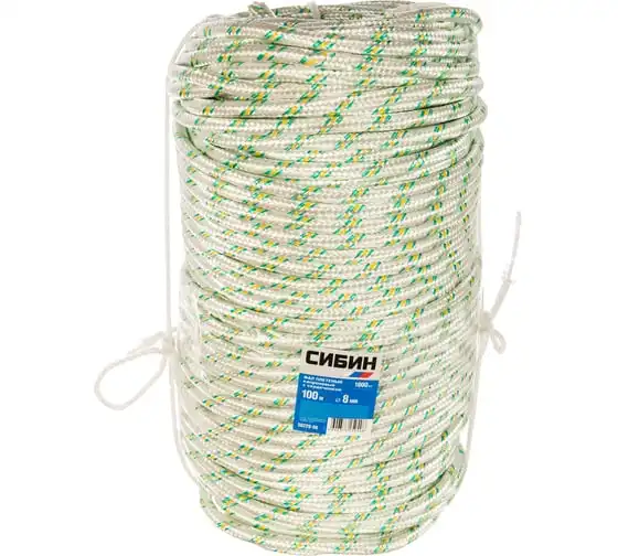 Плетёный капроновый 16-прядный фал с капроновым сердечником, диаметр 8мм, бухта 100м, 1000кгс СИБИН 50220-08