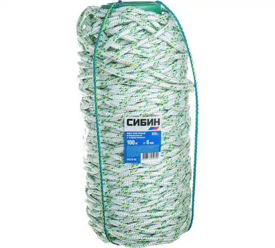 Плетёный капроновый 16-прядный фал с капроновым сердечником, диаметр 6мм, бухта 100м, 650кгс СИБИН 50220-06