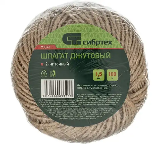 Джутовый шпагат L 100 м, 2-ниточный, 1120 текс, 15 кгс СИБРТЕХ Рос 93876