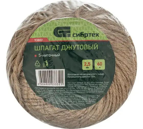 Джутовый шпагат L 60 м, 5-ниточный, 2800 текс, 30 кгс СИБРТЕХ Рос 93882