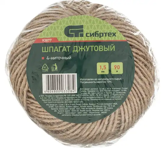 Джутовый шпагат L 90 м, 4-ниточный, 1200 текс, 19,2 кгс СИБРТЕХ Рос 93877