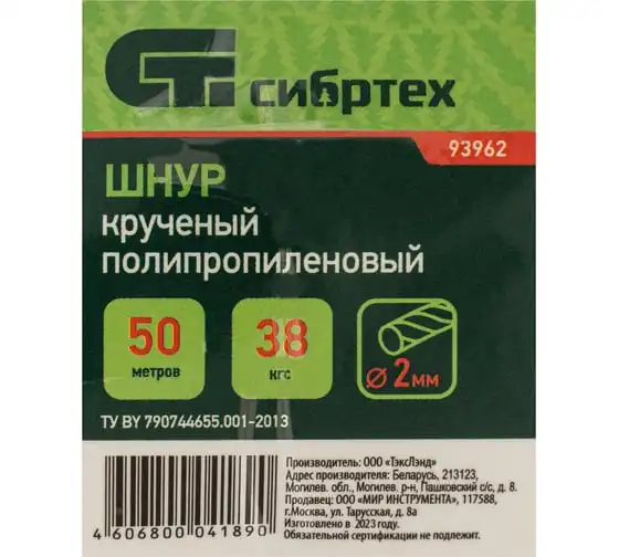 Крученый полипропиленовый шнур 1.5мм, 100м катушка, 29кгс СИБРТЕХ Россия 93961