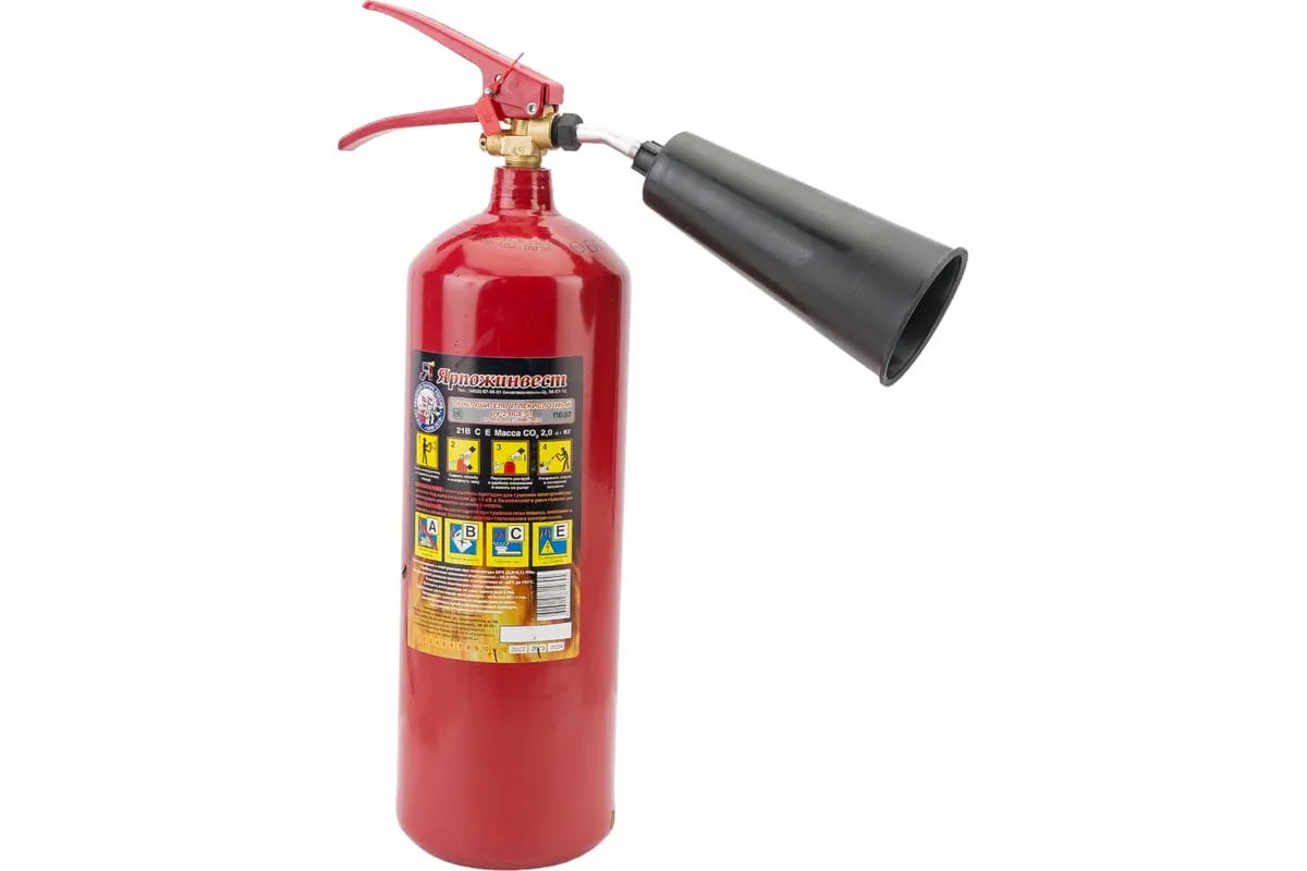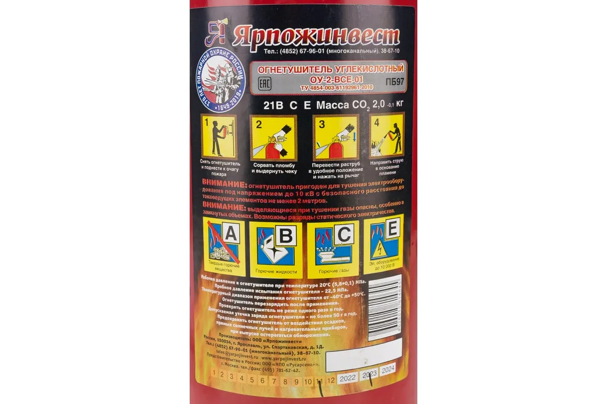 Огнетушитель углекислотный Ярпожинвест ОУ-2 ВСЕ – закачной огнетушитель высокого давления с зарядом жидкой двуокиси углерода (ГОСТ 8050-85), находящейся под давлением жидких паров. Применяется для первичного тушения пожаров и возгораний класса B, C, E (горючие и легковоспламеняющиеся жидкости, горючие газы, электроустановки, не превышающие напряжение 10000 Вольт). Основным преимуществом углекислотного огнетушителя является то, что двуокись углерода не повреждает объект тушения и не оставляет следов.