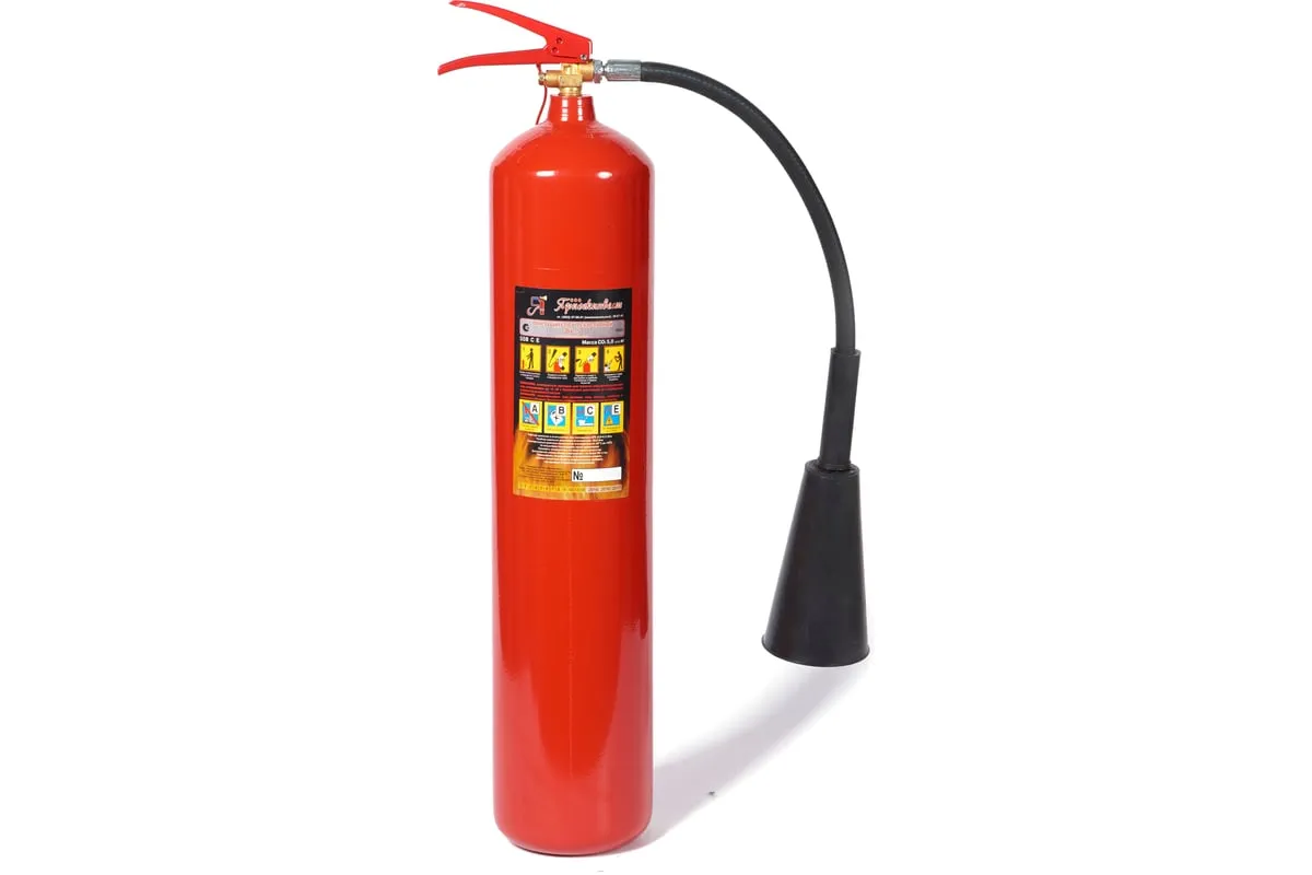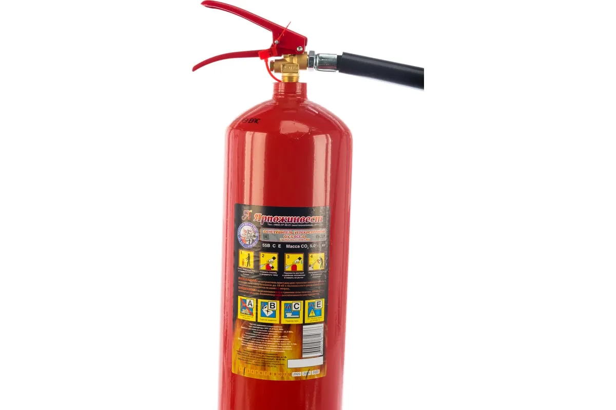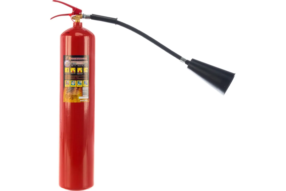 Огнетушитель углекислотный Ярпожинвест ОУ-5 ВСЕ – закачной огнетушитель высокого давления с зарядом жидкой двуокиси углерода (ГОСТ 8050-85), находящейся под давлением жидких паров. Применяется для первичного тушения пожаров и возгораний класса B, C, E (горючие и легковоспламеняющиеся жидкости, горючие газы, электроустановки, не превышающие напряжение 10000 Вольт). Основным преимуществом углекислотного огнетушителя является то, что двуокись углерода не повреждает объект тушения и не оставляет следов.