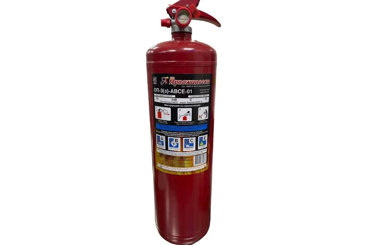 Огнетушитель Ярпожинвест ОП-3 з АВСЕ предназначен для первичного тушения пожаров и возгораний класса A, B, C, E (горючие и легковоспламеняющиеся жидкости, твердые горючие вещества и газы, электроустановки, не превышающие напряжение 1000 Вольт). Комплектуется распылителем на ЗПУ.