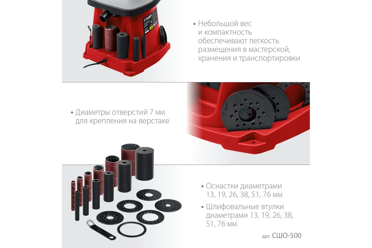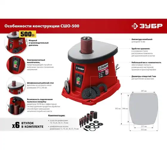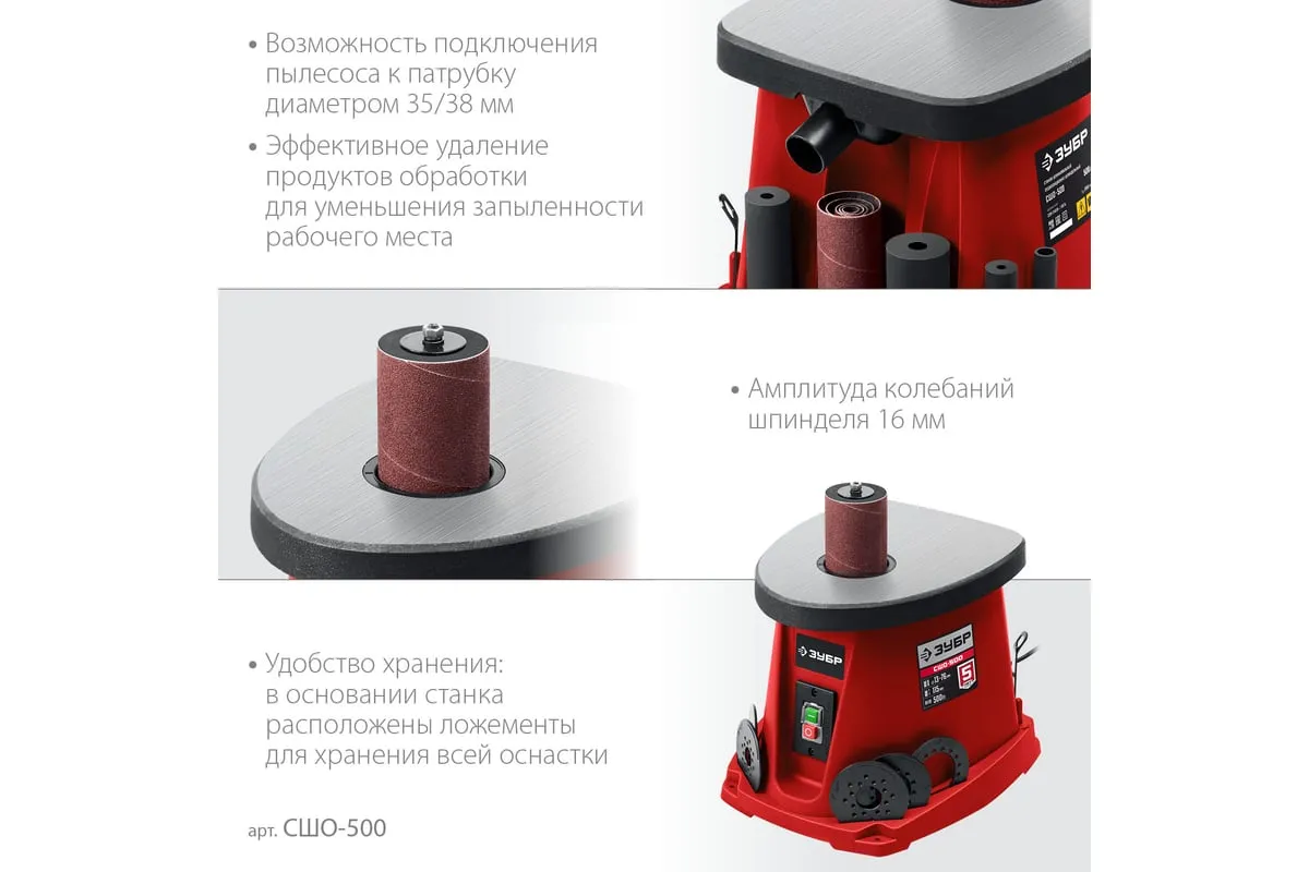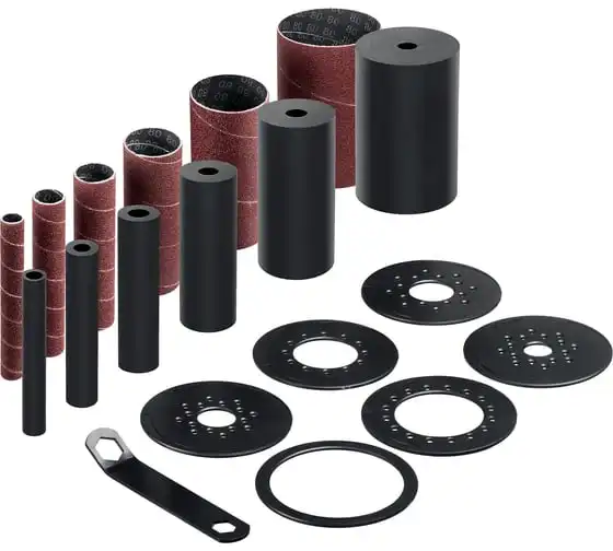 Набор барабанов и абразивных шлифовальных втулок входящих в комплект, позволяет подобрать оптимальную оснастку для обработки. Мощный коллекторный двигатель обеспечивает высокую частоту вращения шпинделя. Станок оптимален для работы с кромками, торцами и краями заготовок с вогнутым профилем. Высокая эффективность при использовании оснастки с такой рабочей поверхностью достигается за счет осцилляции – вертикального перемещения вала. Это увеличивает линейную скорость абразива и предотвращает возникновение продольных царапин из-за дефектов оснастки.