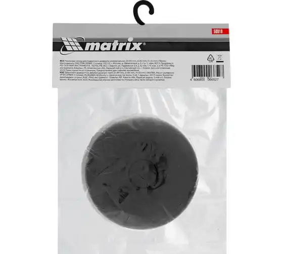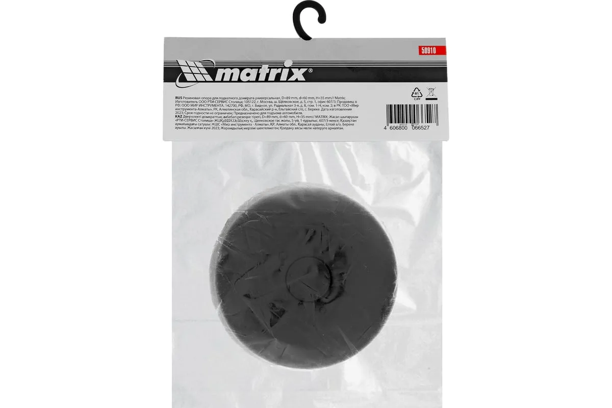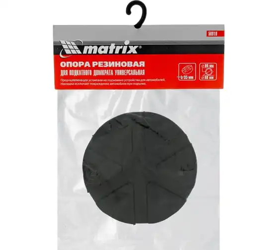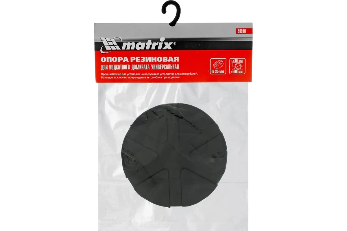 Резиновая опора Matrix 50910, с верхним диаметром 89 мм и нижним диаметром 60 мм, толщиной 35 мм, используется в качестве смягчающей накладки на подкатной домкрат. Снижает риск появления вмятин, царапин и сколов краски на кузове автомобиля, что позволяет произвести его аккуратный подъем. Также защищает от повреждений верхнюю опору домкрата.