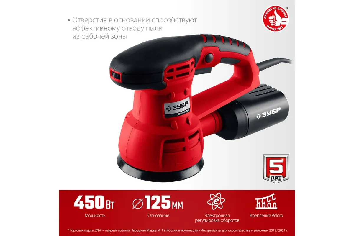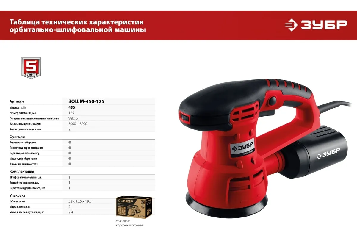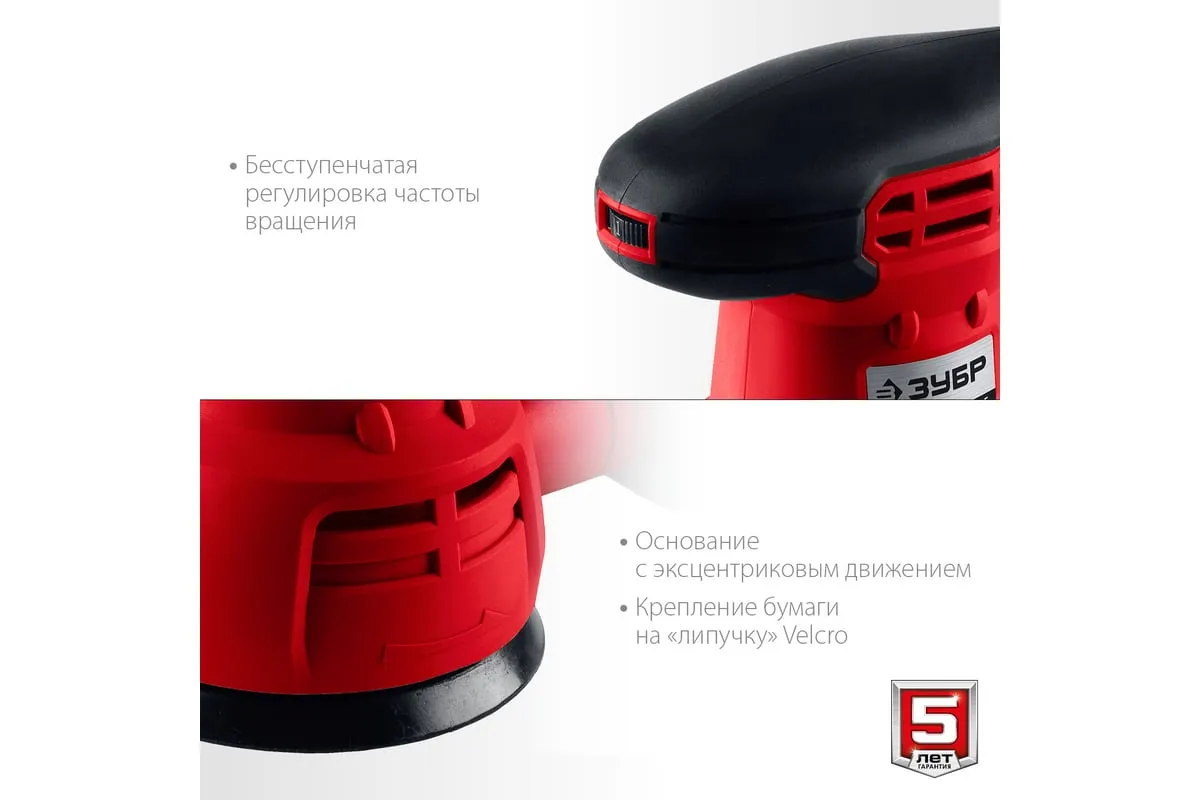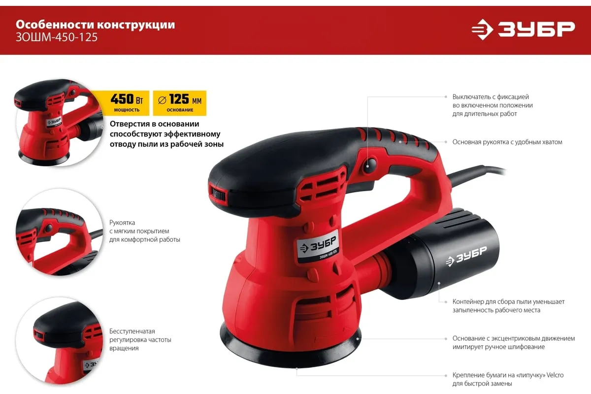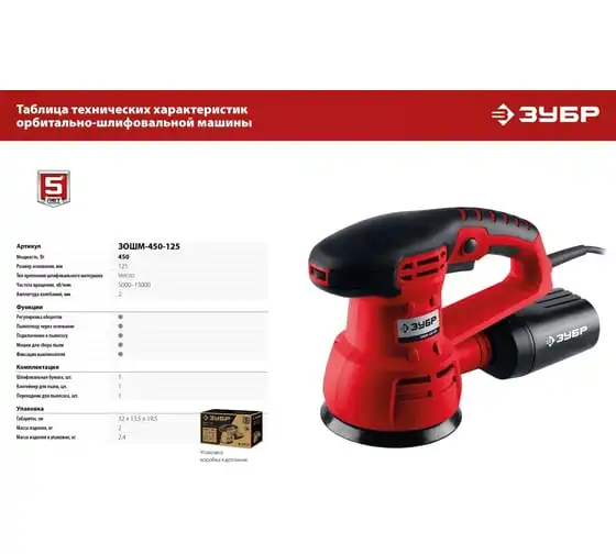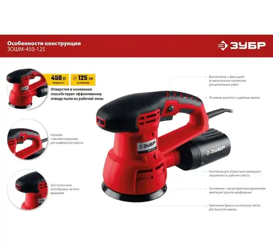 Орбитально-шлифовальная машина ЗУБР ЗОШМ-450-125 предназначена для очистки поверхностей от лака, краски, ржавчины и прочих загрязнений, а также полировки и шлифовки поверхностей. Модель оснащена системой крепления шлифлистов Velcro, что обеспечивает простую и быструю замену оснастки. Количество оборотов регулируется с помощью колесика сверху на корпусе.